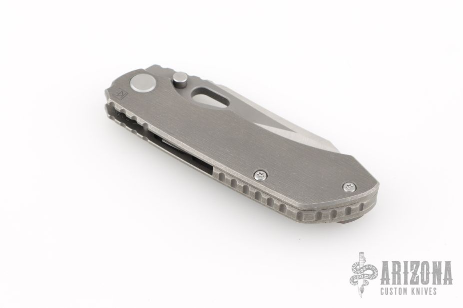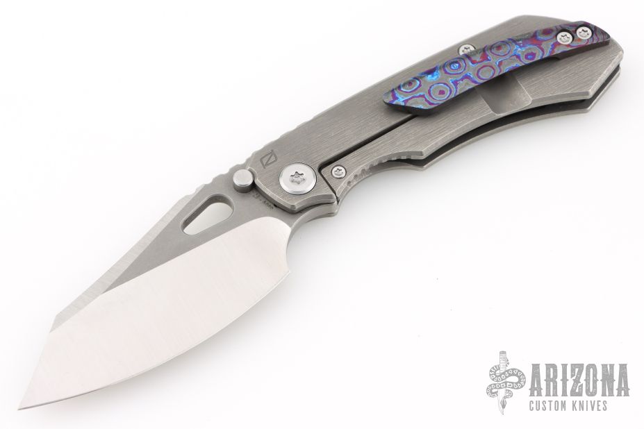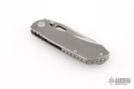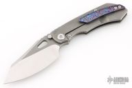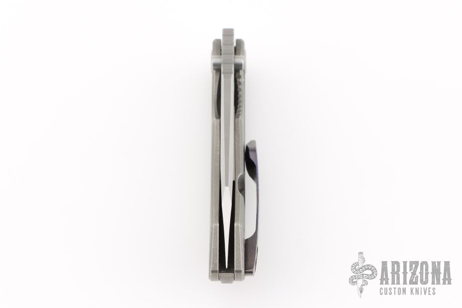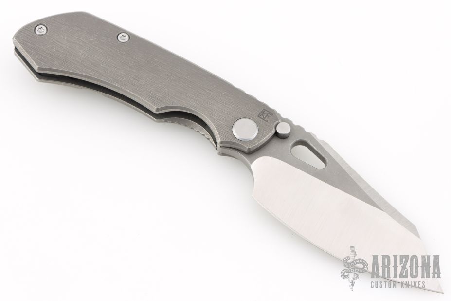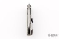 This Left Handed EVO-4 by Custom Knife Factory features a satin blade with notched thumbrest and thumbhole. The handle has a tumbled and bark finished titanium frame with a custom black Timascus tip up clip by Adam Purvis, and a tumbled titanium backspacer. Comes with CKF velcro case, extra hardware, original clip and COA #77 dated 2-24. Nice detent, lockup and blade seating. Excellent Condition.