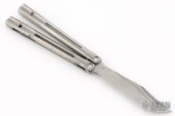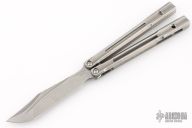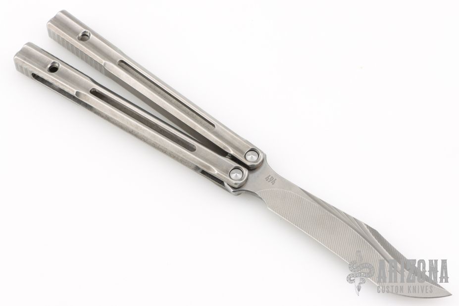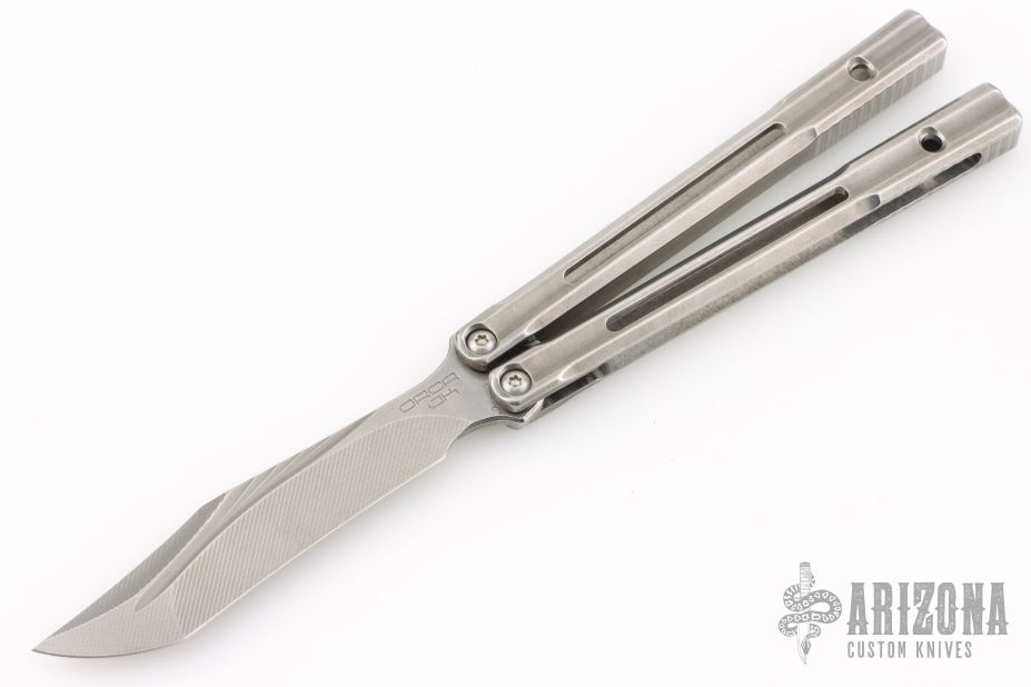 This balisong by JK Design features a milled, bead blasted, upswept recurve clip point bade. The handles are anodized titanium with milled full channel, bronze phosphorus washers and steel bushings. Excellent Condition.