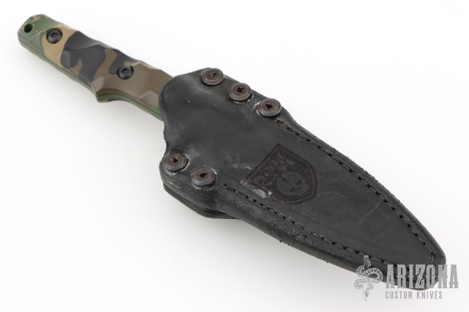 This Muninn Dagger by Bawidamann Blades was named after Odin’s Raven. It features a camo blade with notched thumbrest and sharpened top edge, .104" blade stock and 1.223" blade depth, full tang construction. The handle has camo coated metallic scales. Comes ready to carry with a Chattanooga leatherwork sheath with metal clip. The scales have some chips in the coating. Excellent condition.