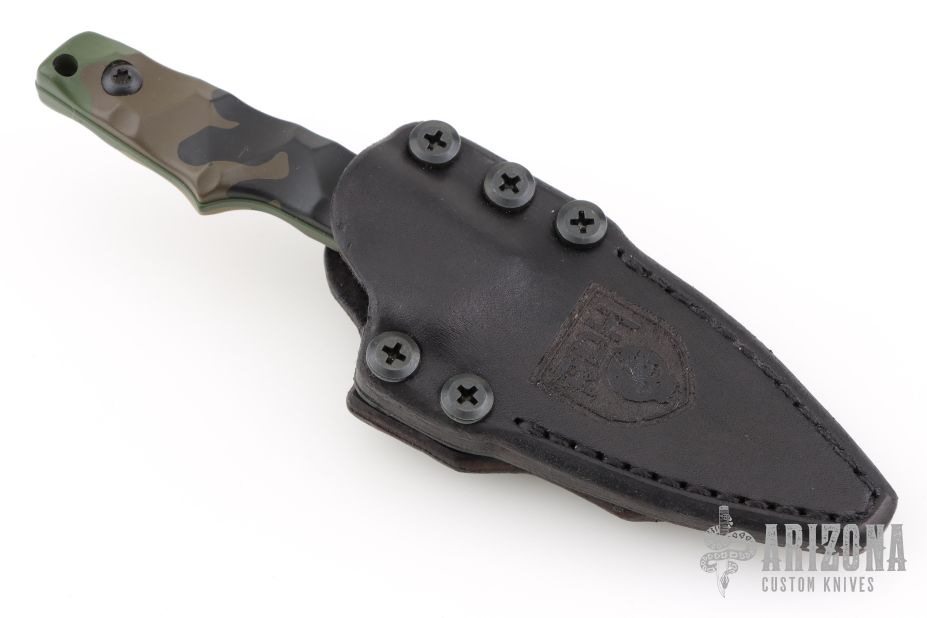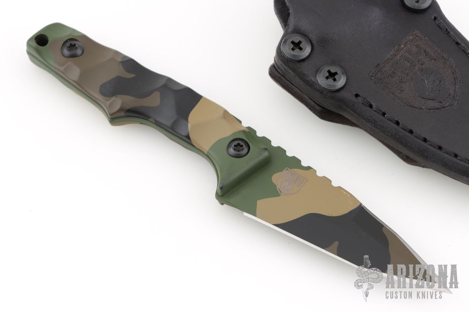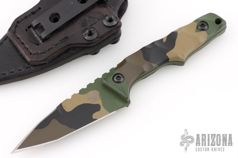 This Huginn Dagger by Bawidamann Blades was named after Odin’s Raven. It features a camo blade with notched thumbrest and sharpened top edge, .104" blade stock and 1.090" blade depth, full tang construction. The handle has camo coated metallic scales. Comes ready to carry with a Chattanooga leatherwork sheath with metal clip. The scales have some chips in the coating. Excellent condition.
