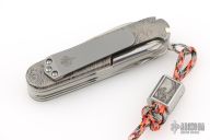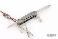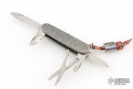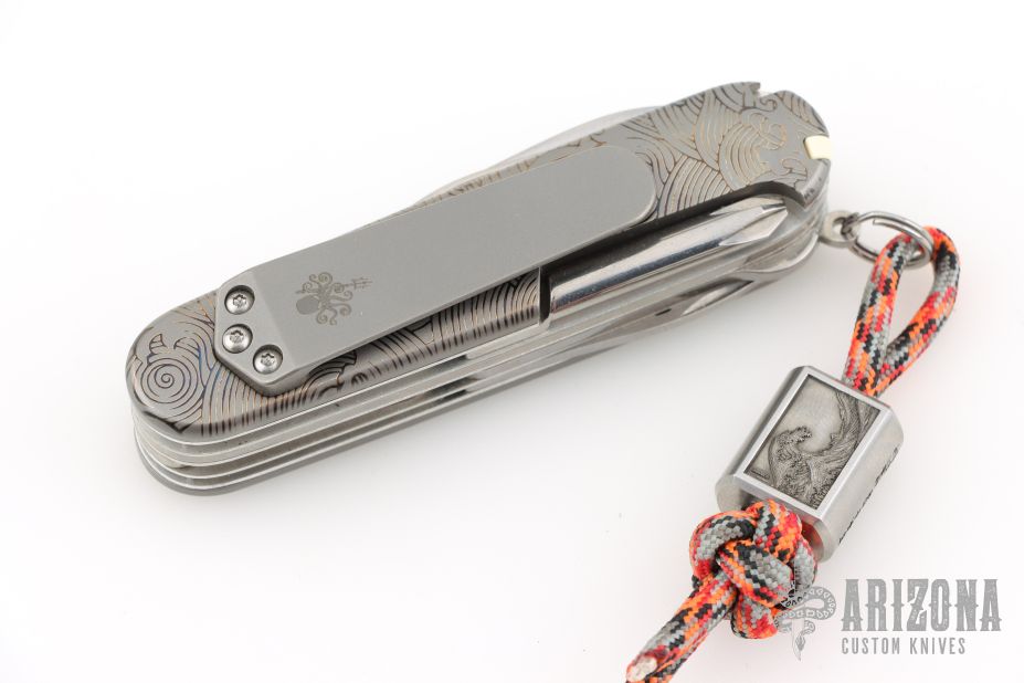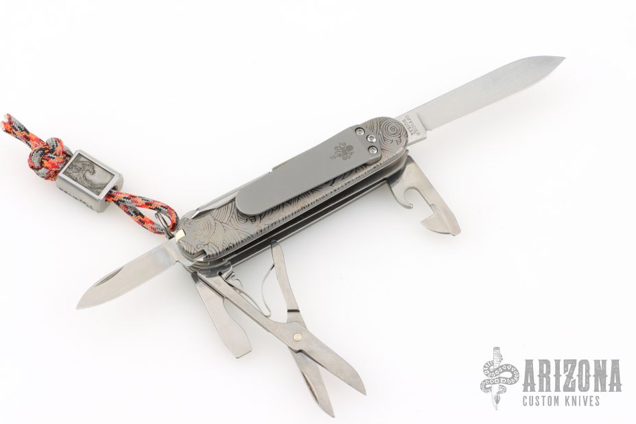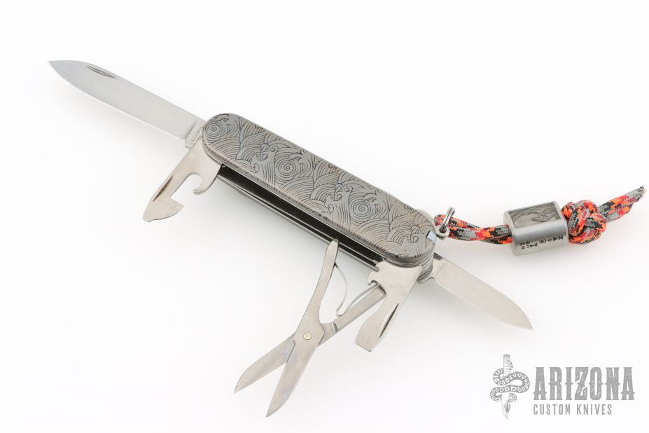 This Swiss Army Knife from Victorinox has Prometheus Design Werx scales and clip. Listing also includes attached lanyard with Kevin King Leather Great Wave laser engraved bead.