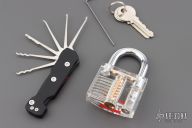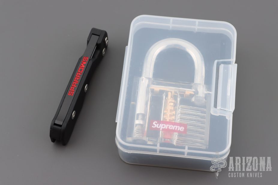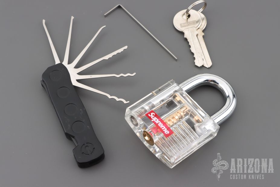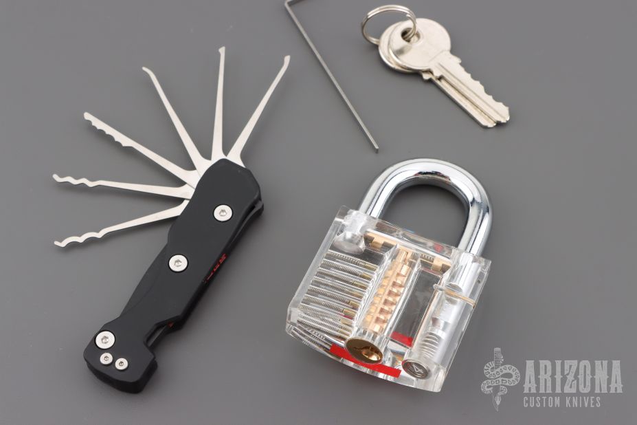 The most unique feature is the quick lock bar which locks all picks and a tension wrench that easily slides out of a trap door. When not in use all the picks are locked in place and the tension wrench is securely held within the frame giving you a tool that has a compact size you can easily incorporate into your EDC.
