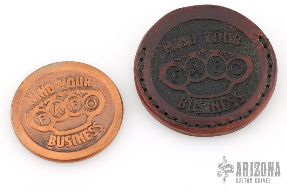 Uncle Stumpy/Snuckles/FAFO/Mind Your Business Copper Challenge Coin with Leather Sheath. One of the coolest ones made! Excellent Condition.
