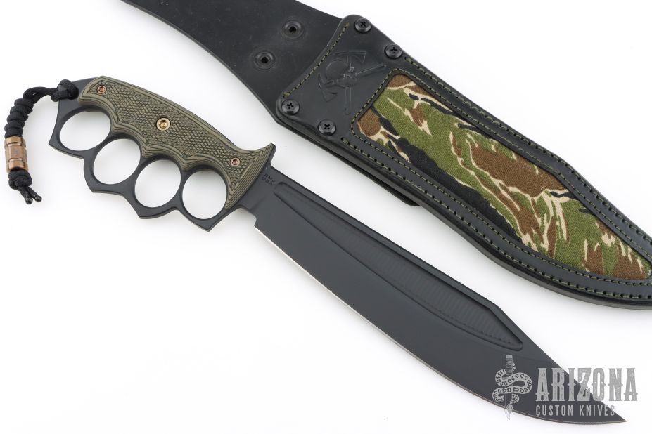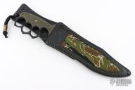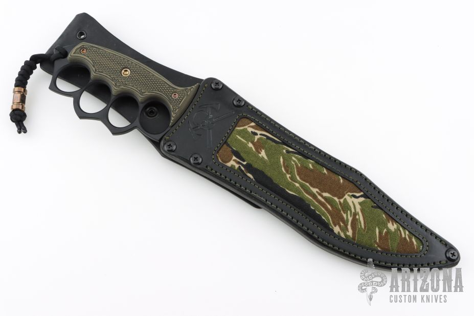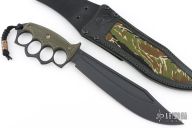 - Black Cerakote Blade | Dirty Olive Handles | Black Leather with Tiger Stripe Inlay Sheath