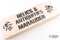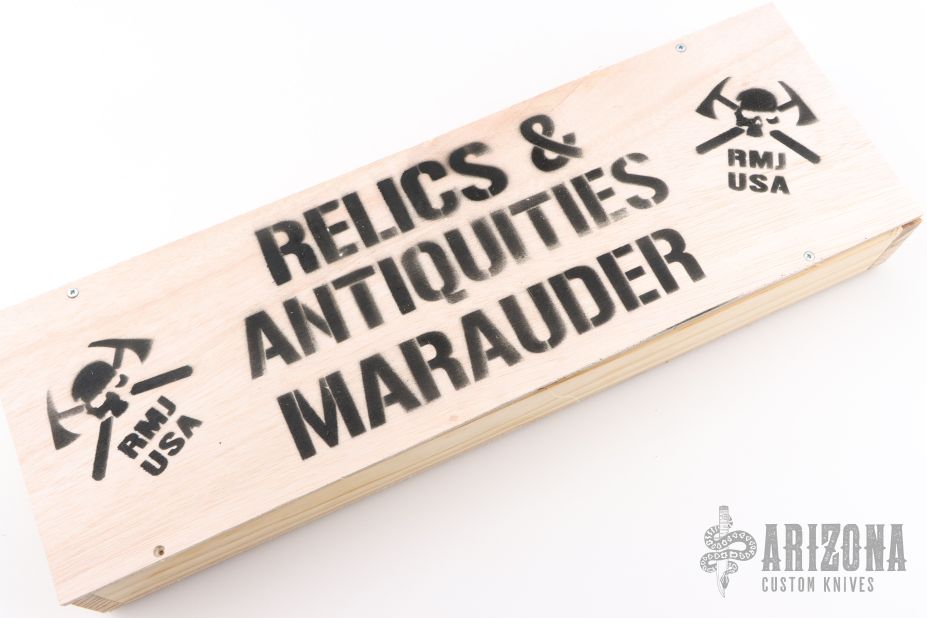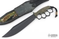 Embodying history and our own design philosophies, the Marauder is our twist on a larger than life, Trench Bowie. We decided to go big with a 15.25" overall length, and 9 5/8" CPM-3V bowie style blade with an aggressive fuller. The knuckle duster style handle acts as a guard to protect your hands, and the aggressive outward shape works well for raking. To round out the overall shape, the end of the handle features a pronounced pommel for hammer-striking. The handle is finished with Black G10 handle slabs that are attached with Grade 5 Titanium fasteners. Marauders include a leather sheath with camo inlays on both sides. The sheath is ambidextrous, and can be worn on a belt or attached to PALS webbing.