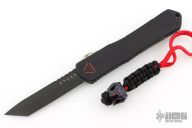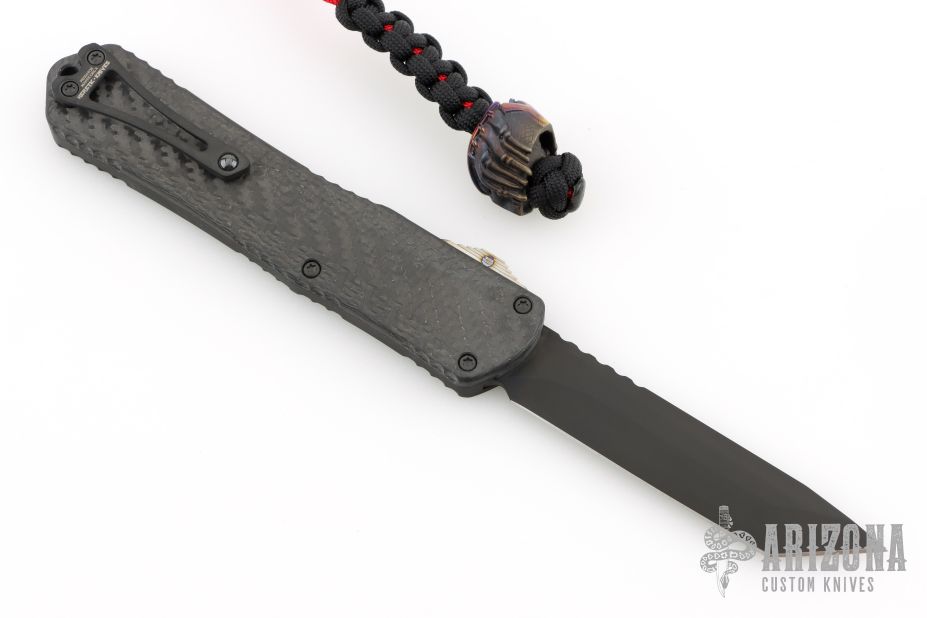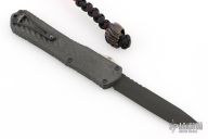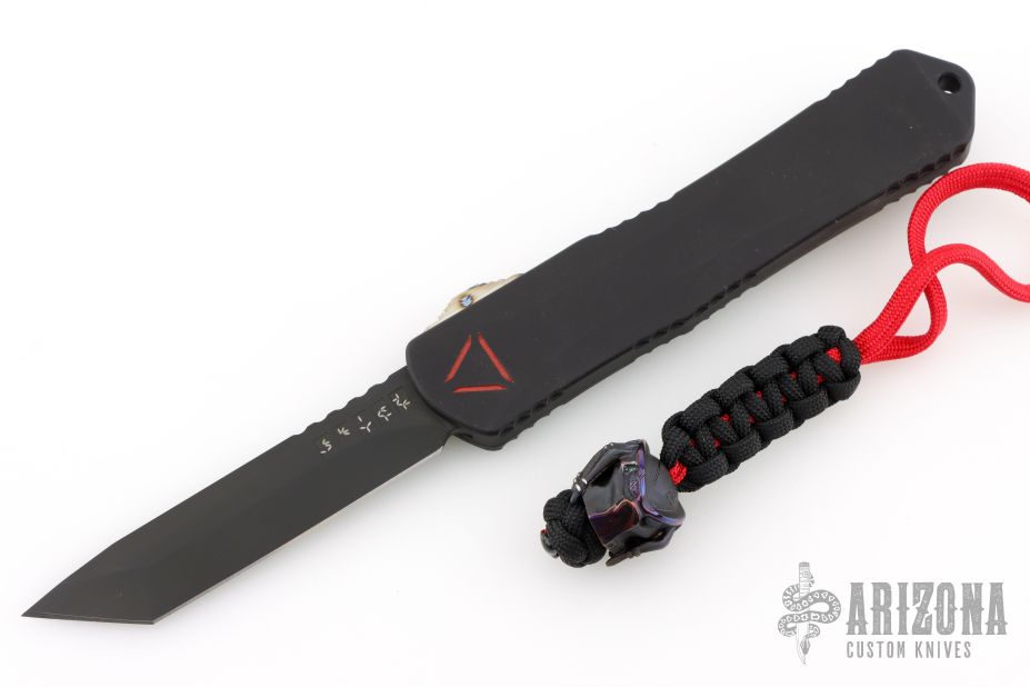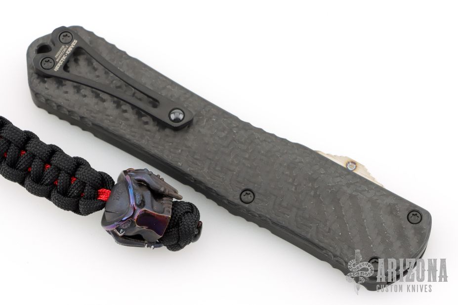 This Manticore-X by Heretic Knives features a black tanto blade with notched thumbrest. The handle has a black aluminum frame, carbon fiber top, black stainless steel hardware and tip down clip, and flamed titanium thumbslide. Comes with original box and papers. Comes with a cobalt Predator bead. Has a couple light scuffs on the body, otherwise Excellent Condition.