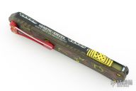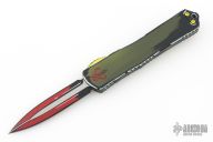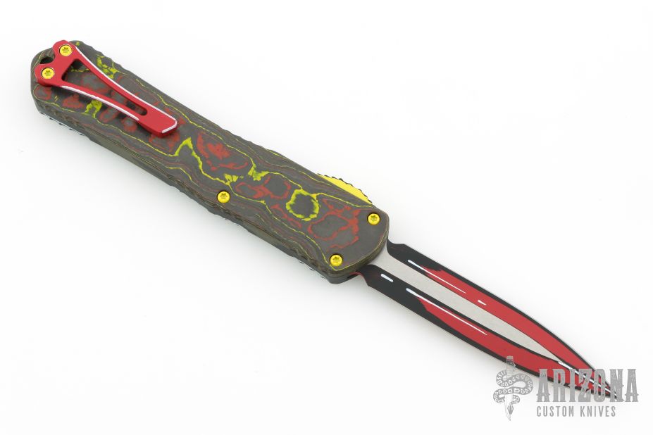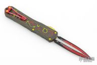 This Manticore-X by Heretic Knives features a red/white cel shade finished double-edged blade. The handle has a green/black aluminum frame with black splash and yellow stainless steel hardware and red tip down clip. S/N 068 dated 05/25. Comes with original box, card, and lube. Excellent condition.