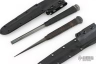 The WK Pick is a tool designed to punch holes, break ice, and dig. In addition, it can be used as an effective defensive weapon to stop an attacker. Pick has a leather wrapped handle to enhance grip. The simple molded sheath has a removable spring belt clip. Without the clip the sheath will fit in standard Molle loops on a vest or pack. Lashing holes facilitate alternate mounting. Tool Specifications Blade steel: 80CrV2 Black oxide no-glare finish Tool length: 7 1/2" Blade thickness: 1/4" Sheath Un-Lined Kydex®. Excellent Condition.