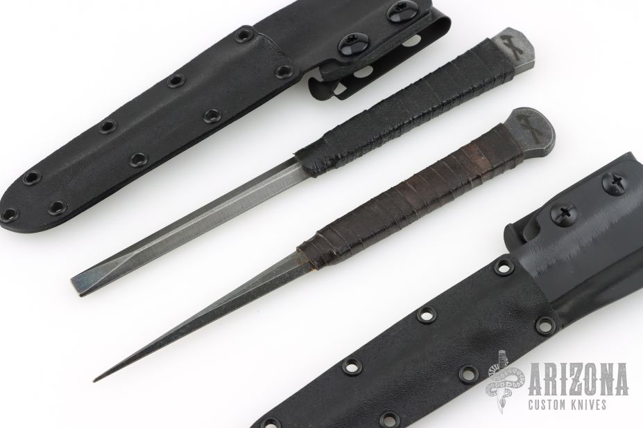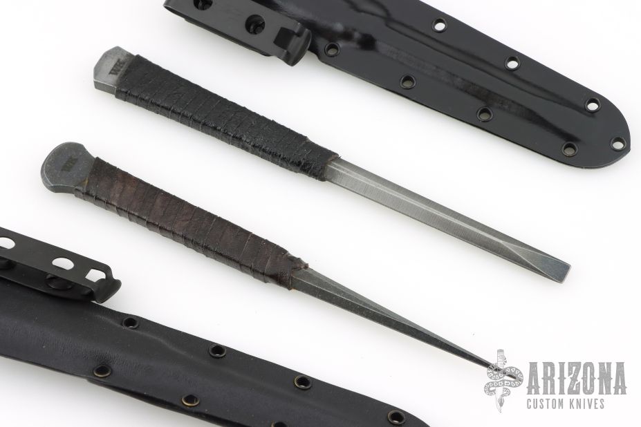 The Winkler Knives Screwdriver Pick is a tool designed to turn Slotted Screws, punch holes, break ice, dig. In addition, it can be used as an effective defensive weapon to stop an attacker. The Screwdriver Pick has a leather wrapped handle and a Black Oxide finish. The simple molded sheath has a removable spring belt clip. Lashing holes facilitate alternate mounting.