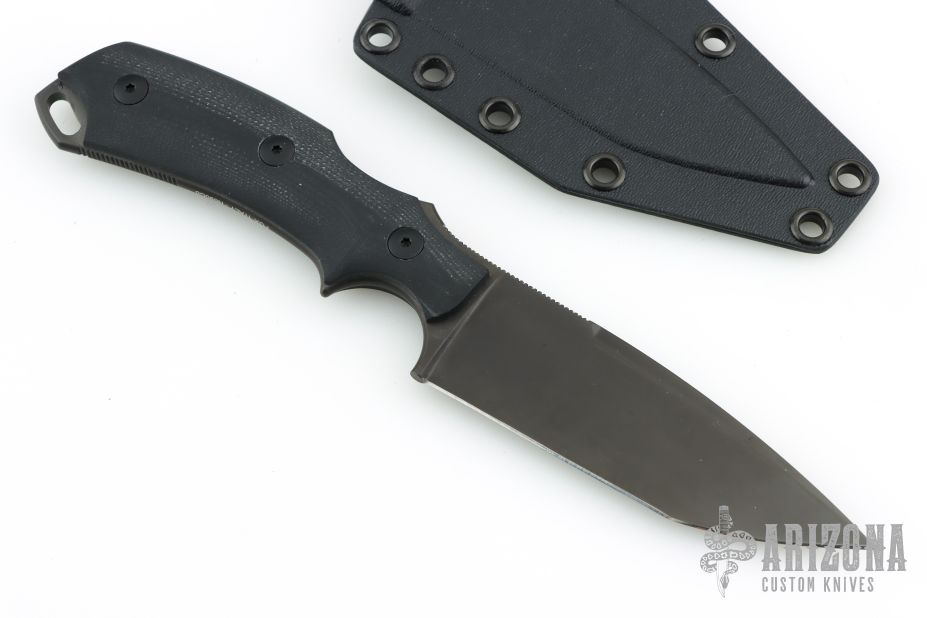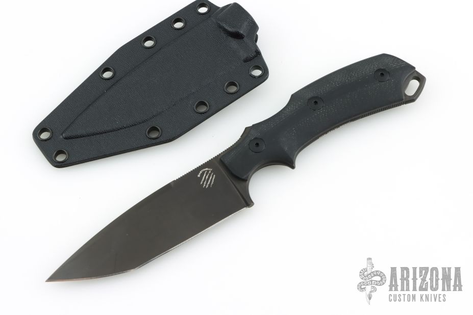 This RED V2 by Bastinelli Knives features a black PVD coated N690 blade with notched thumbrest, .157" blade stock and 1.233" blade depth, full tang construction. The handle has G10 scales, lanyard hole at the butt, notched tang. Comes with kydex sheath with clip and original box. Has a couple light scuffs, otherwise Excellent condition.