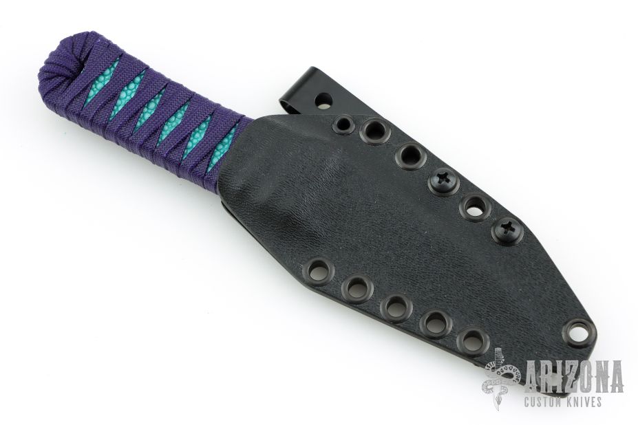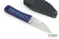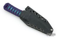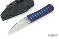 This REV by Auxiliary Manufacturing features a Damascus blade .190" blade stock and 1.009" blade depth. The handle has epoxied purple cord wrap over dyed ray skin. Includes a kydex sheath, the original box and papers. Excellent condition.