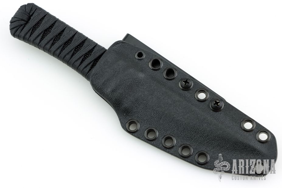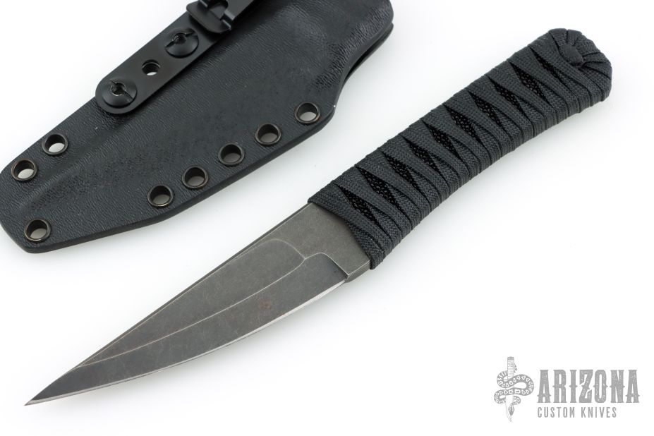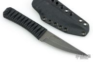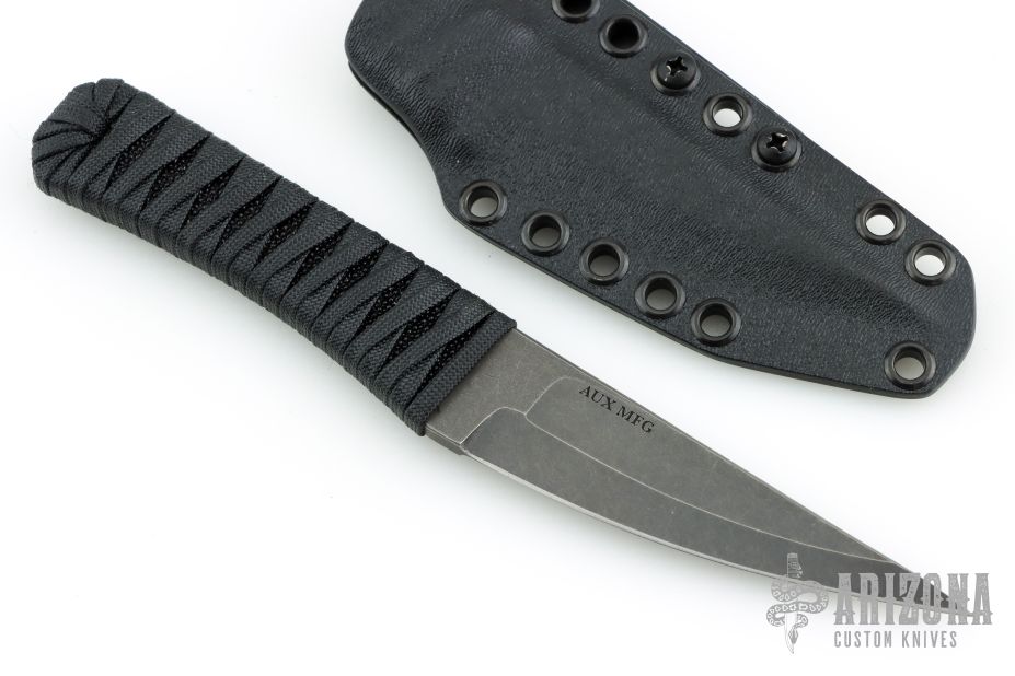This KTK by Auxiliary Manufacturing features an acid tumbled blade with .195" blade stock and 1.096" blade depth. The handle has a cord-wrapped grip over stingray skin. Comes with a kydex sheath with clip, card, and box. Excellent condition.