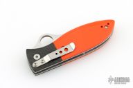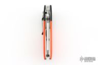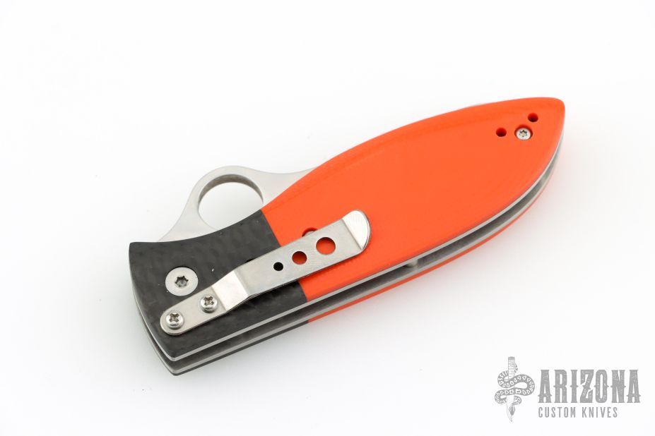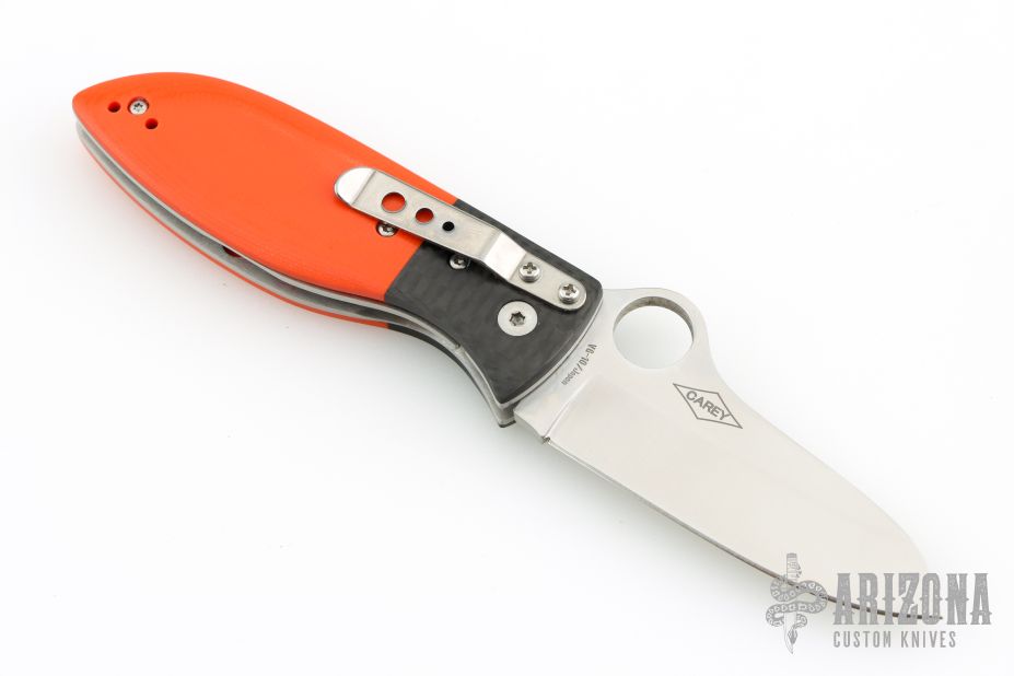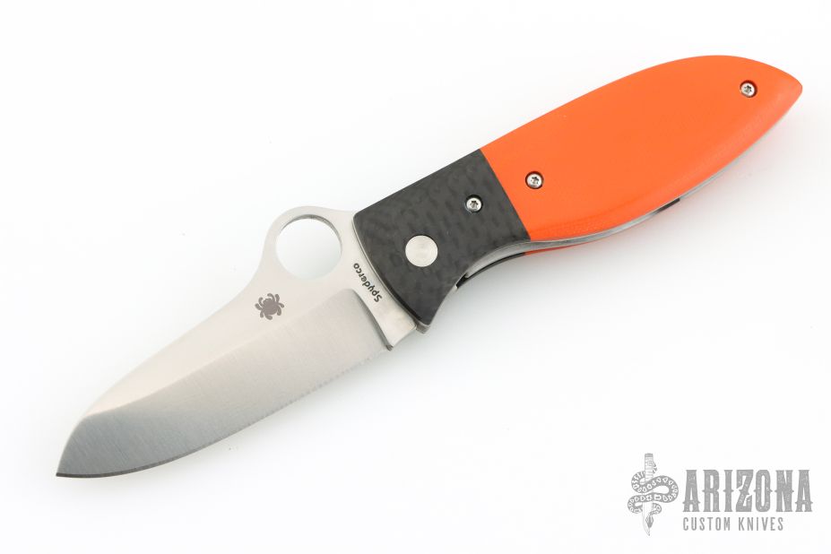 This Firefly Pln by Spyderco Knives is a Peter Carey design, it features a satin finished blade with thumbhole. The handle has carbon fiber bolsters, orange G-10 scales, stainless steel liners, standoffs, and a tip up or down reversible stainless steel clip. Discontinued. Comes with original box. Excellent condition.
