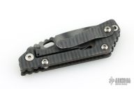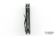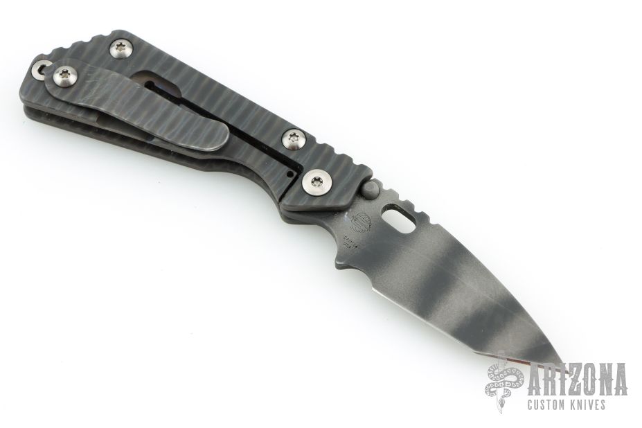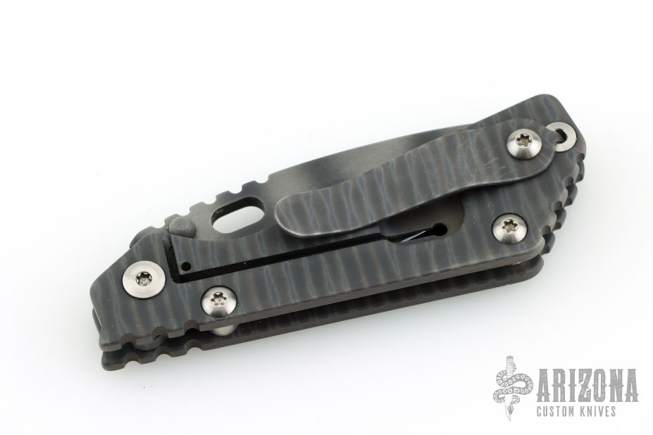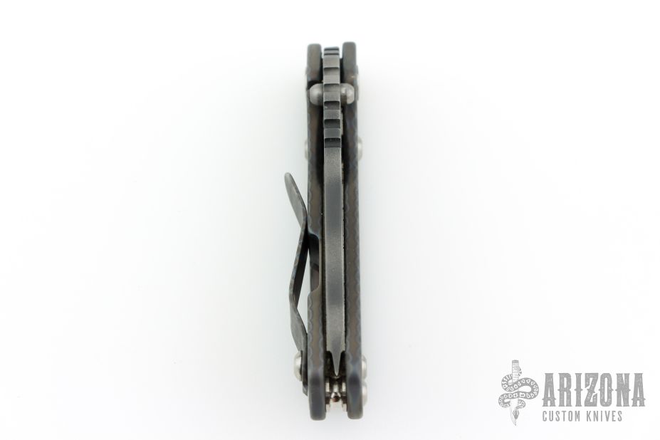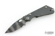 This PT by Mick Strider features a tiger striped blade with notched thumbrest and thumbhole. The handle has a flame finished titanium frame with matching tip up clip. Has scuffs and scratches, great overall condition otherwise.