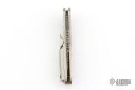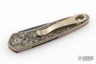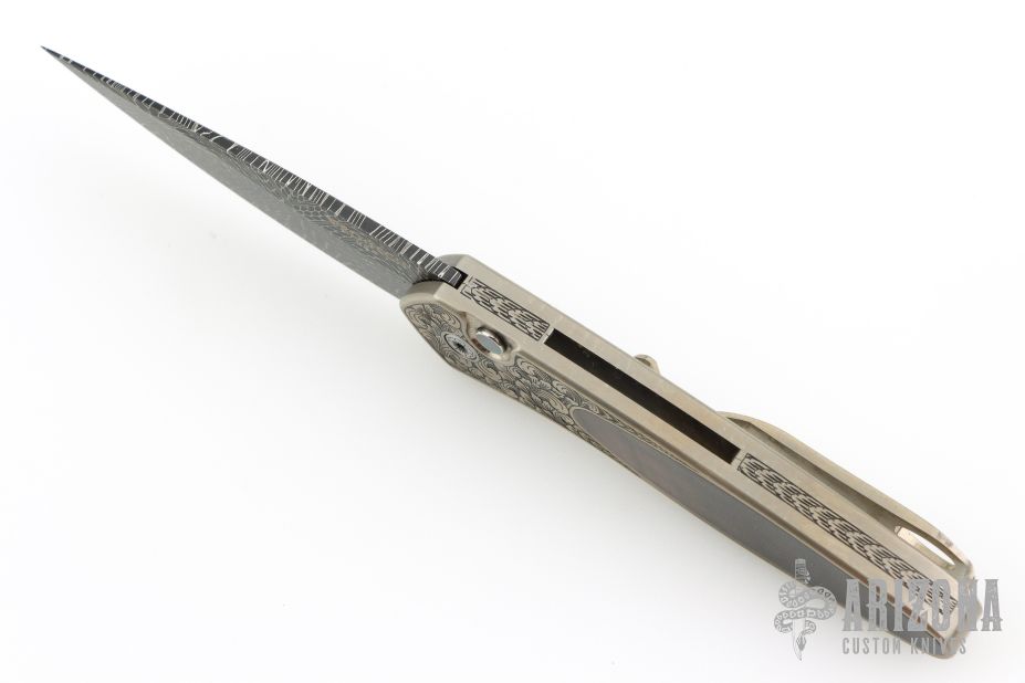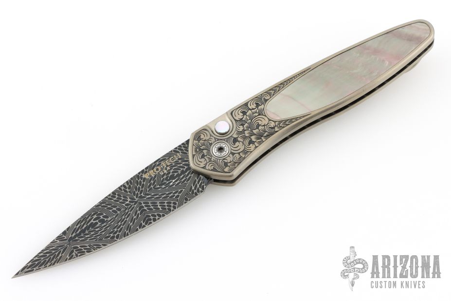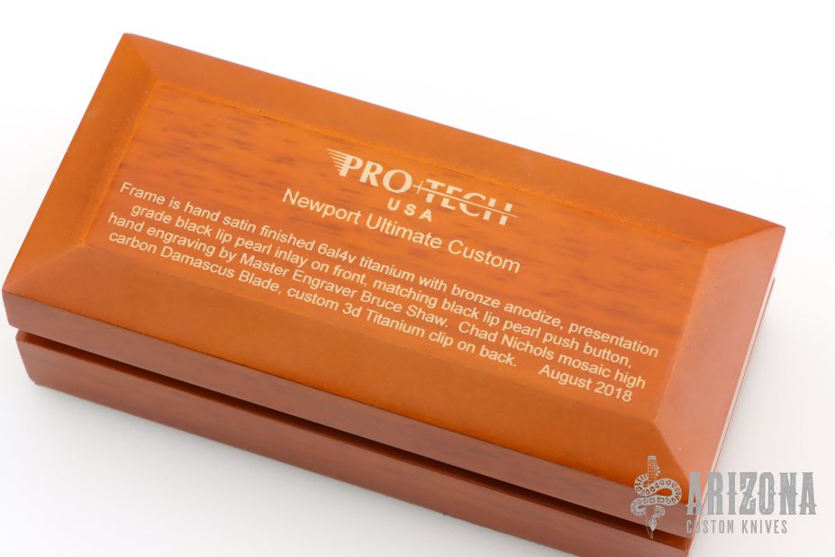 This Newport Titanium Ultimate Custom by Pro-Tech Knives features a Chad Nichols Mosaic Damascus spear point blade. The handle has a bronzed and Bruce Shaw engraved titanium frame with Black Lip Mother of Pearl inlays in handle and push button, milled titanium tip up clip. Comes with original box, laser engraved wooden box, and papers. Excellent Condition.