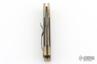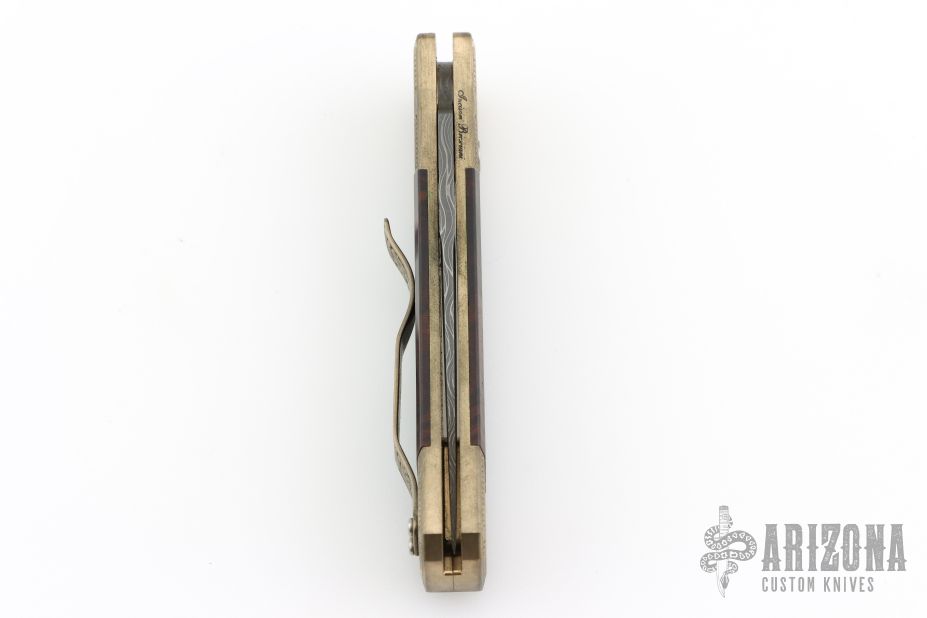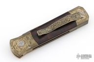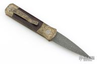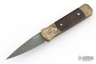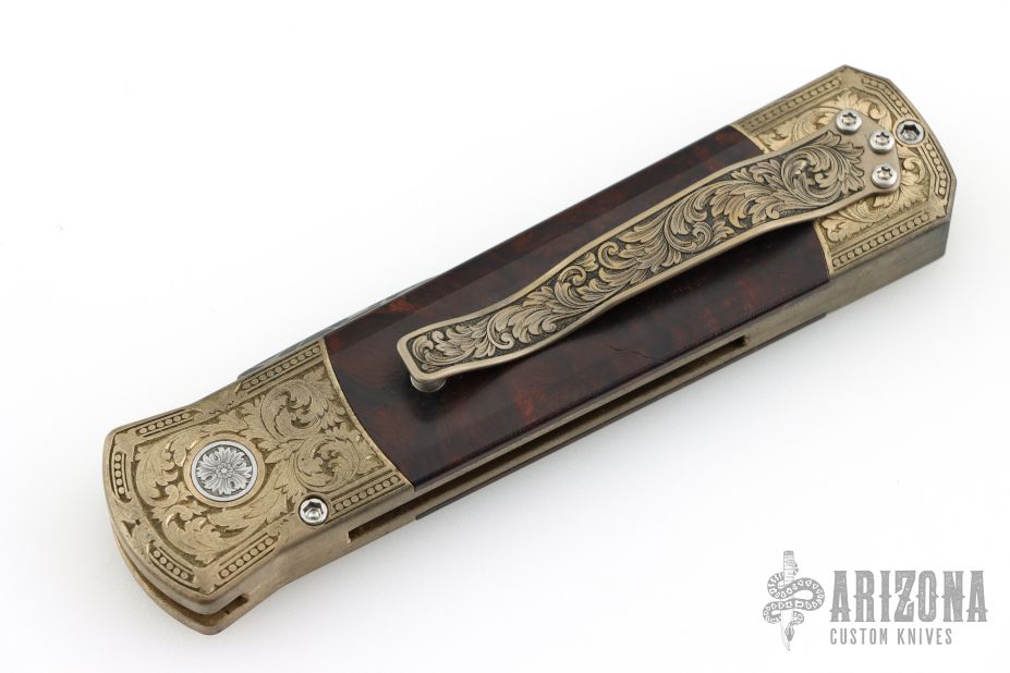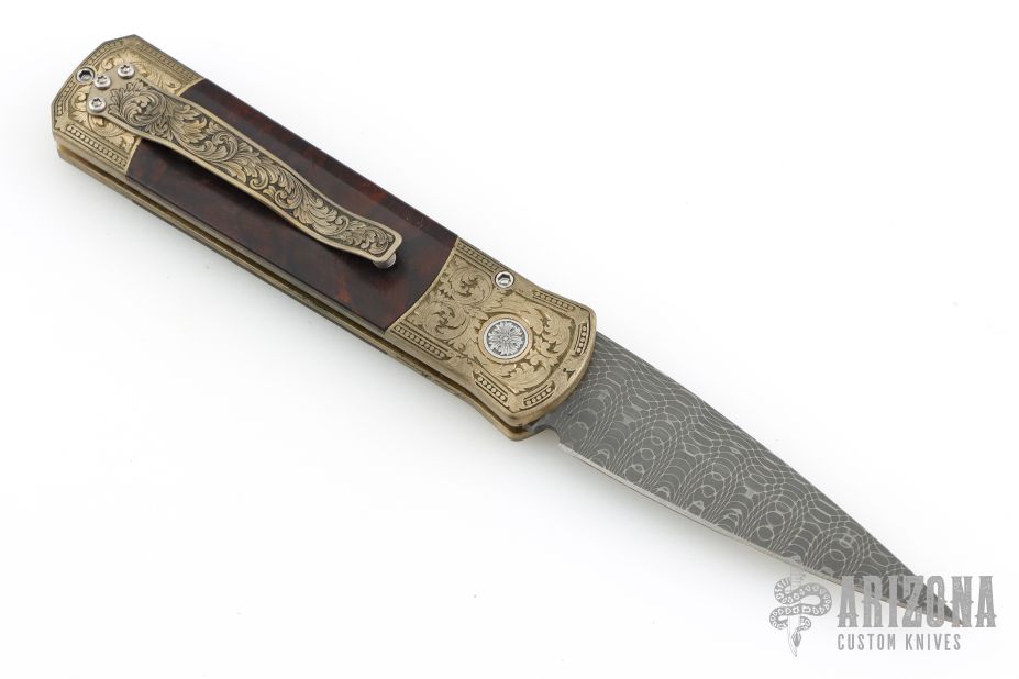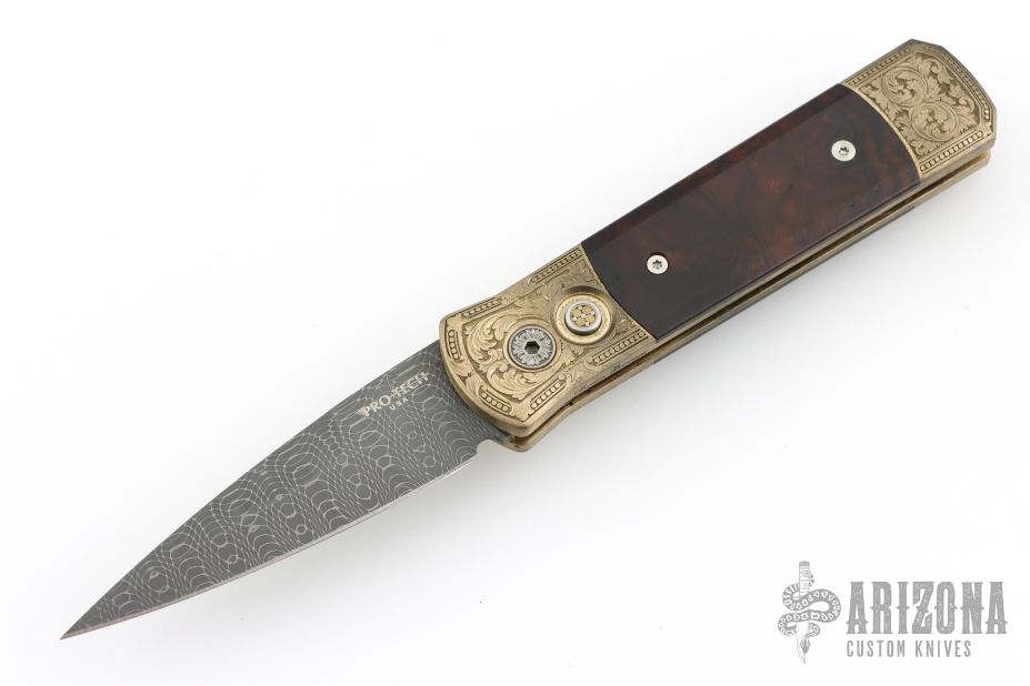 This Godson Ultimate Custom by Protech features a Vegas Forge Spirograph Damascus blade.  The handle features a bronze aluminum frame with Bottega Incisioni engraved bolsters, desert ironwood scales and a mosaic push button.  Includes original box, laser engraved wooden box, pouch, and papers. Excellent condition.