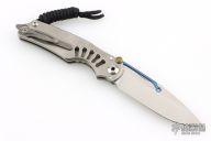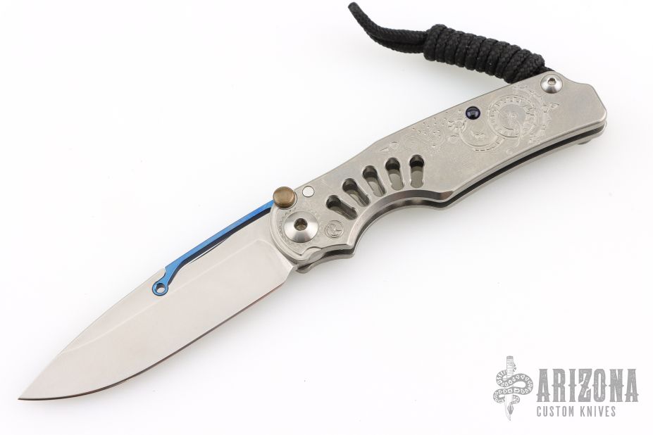 This particular knife is the "Blue Steam" edition which features an engraved pattern in the titanium as well as a blue sapphire cabochon. Knife is in excellent condition. Comes with original box, sheath and papers dated April 27, 2015.