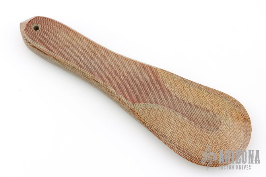 This Patu by the Jones Brothers is made of brown micarta. It is 9" long, 3" wide at the thickest end and 1.5" wide at the smaller end, appx .875" thick. New condition.