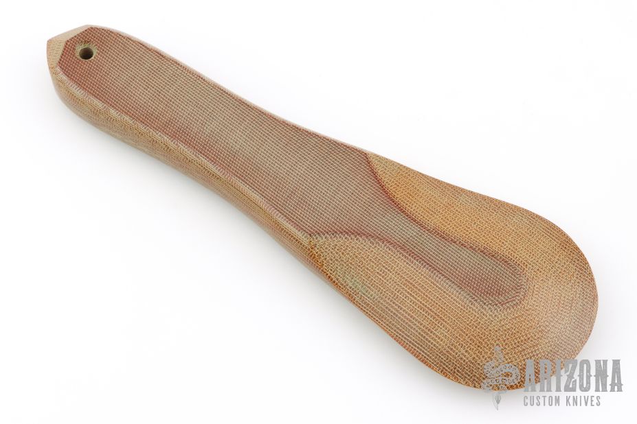 This Patu by the Jones Brothers is made of brown micarta. It is 9" long, 3" wide at the thickest end and 1.5" wide at the smaller end, appx .875" thick. New condition.