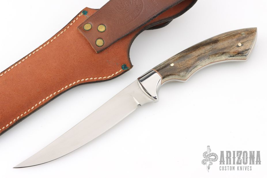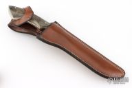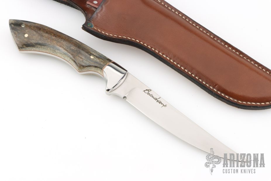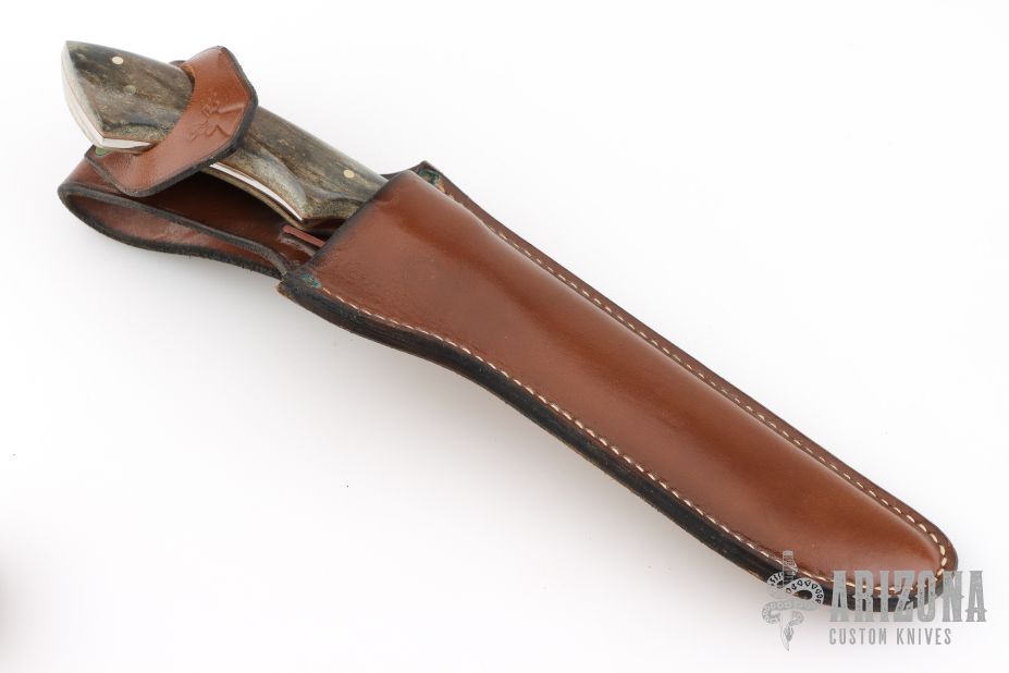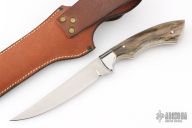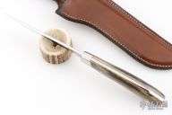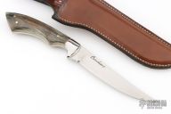 This piece by Gaetan Beauchamp features a hand rub satin finished blade with .132" blade thickness and .920" blade depth, full tang construction. The handle has dovetailed mirror polished stainless steel bolsters, stabilized bone scales with tan liners, nickel silver pins. Nicely contoured handle. Comes with a brown leather sheath by Morseth, not original, but fits very nicely. Excellent condition.