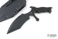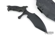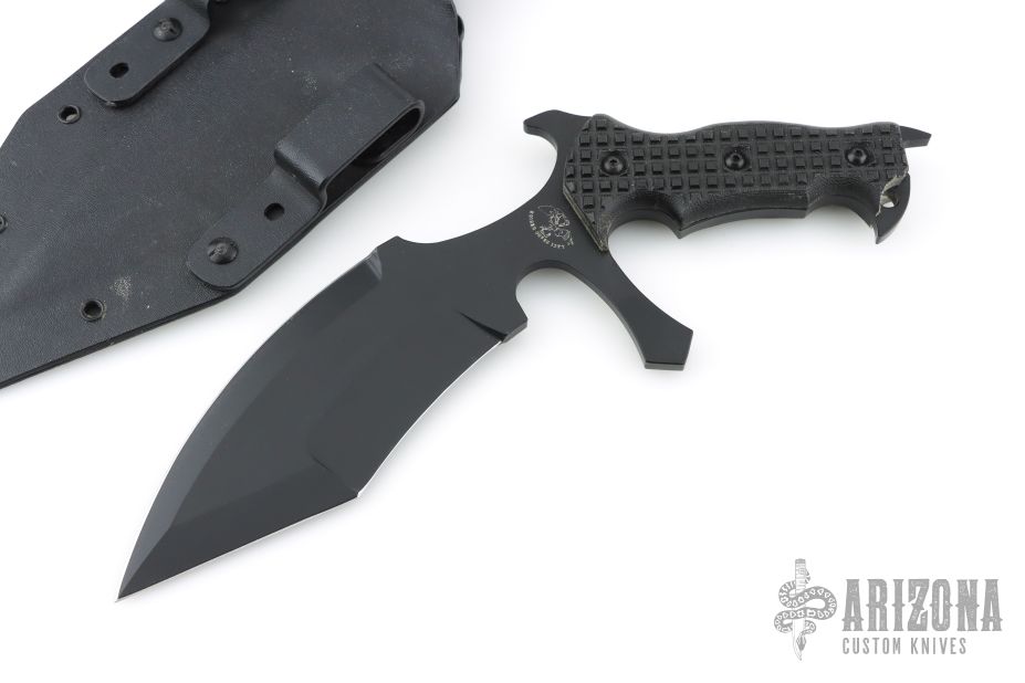 This Vampire UUK is a Laci Szabo design made by Robert Martin. It features a black coated double-edged blade, .264" blade thickness and 2.441" blade depth, full tang construction. The handle has black micarta scales with frag pattern. The UUK, or Urban Utility Knife is the most well-known of Laci Szabo's designs. One mean field-tested tactical. Comes with kydex sheath with belt loops. New condition.