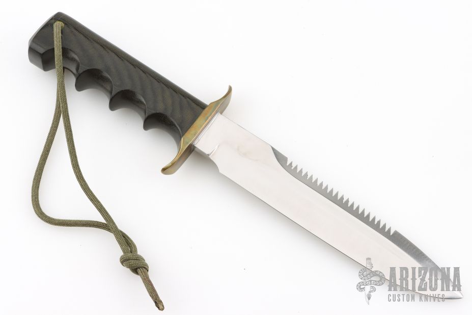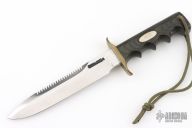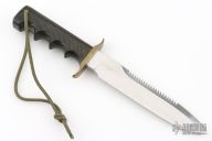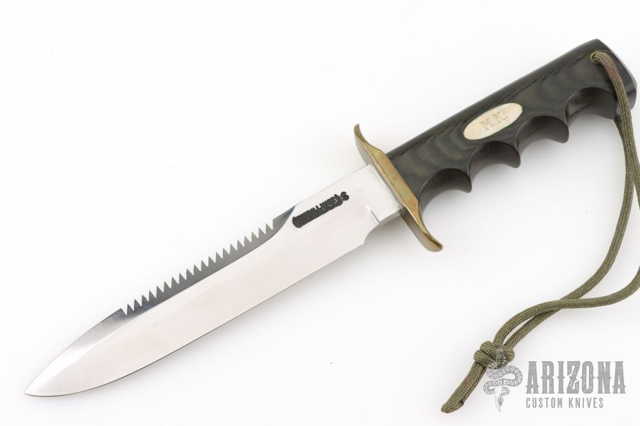 The Model 16-7 Diver or Special Fighter was designed especially for heavy-duty salt water use and is as nearly indestructible as possible. This knife has a stainless steel blade with sawteeth and sharpened top edge, .233" blade stock and 1.227" blade depth, full tang construction. The handle has a brass guard, black linen micarta finger groove handle with a lanyard hole and nickel silver escutcheon with "M.K." engraved on it. Has a couple very light scratches, otherwise excellent condition.