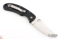 The Tim Wegner C48 by Spyderco is a very collectable Spyderco knife that has been discontinued and is designed to be a hunter with its large hunter trailing point blade. Tim Wegner ended up producing this knife with Blade Tech. Plain Edge and satin finished blade, ATS34. Textured black G10 handle. Stainless tip up carry clip and liner. Has a nice detent, lockup and blade seating. Excellent condition. Comes with a period correct Spyderco box.