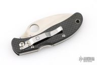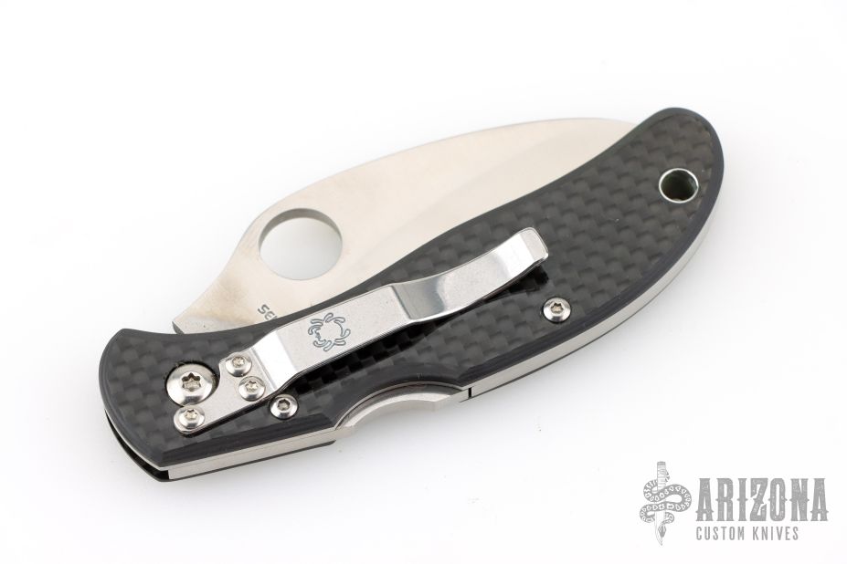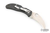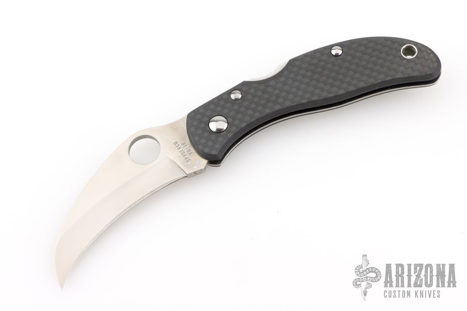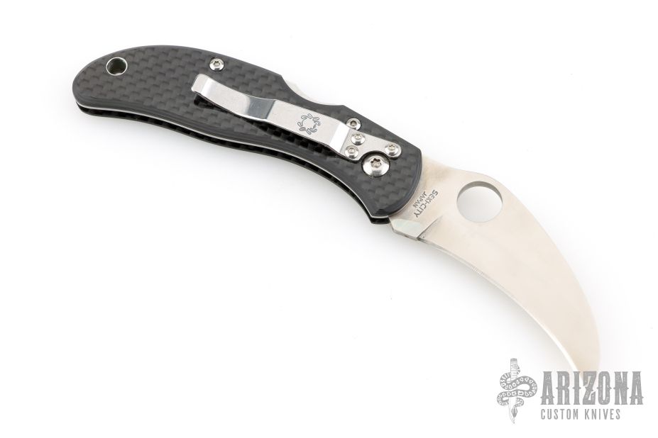 This C08CF by Spyderco features a hawkbill style blade with satin finish and thumb hole. The handle is comprised of carbon fiber scales with lanyard tube over a single steel liner and steel backspacer. The steel clip is positioned for tip down, right hand carry. Comes with original box. Excellent condition.