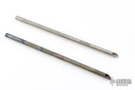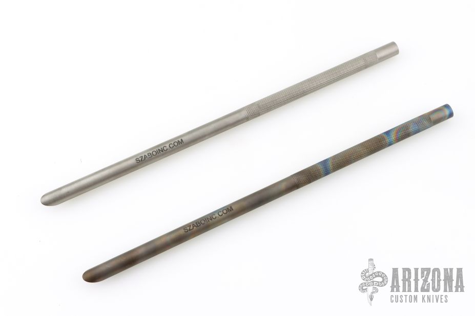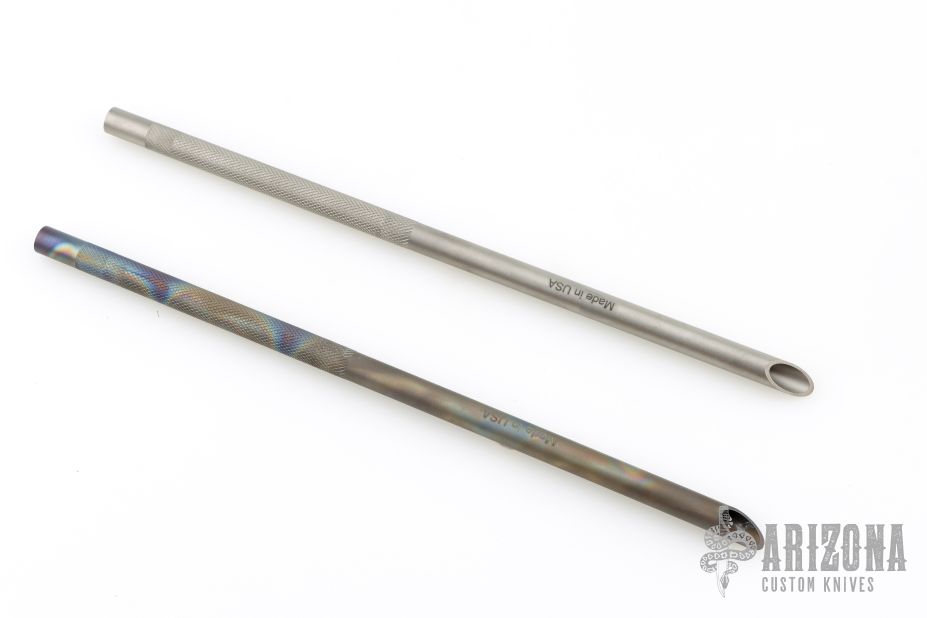 This Vampire Straw by Laci Szabo features a 10" integral construction hollow titanium rod, with knurled grip, .38" width, and sharp tip. One is anodized and one is bead blasted. New from maker.