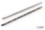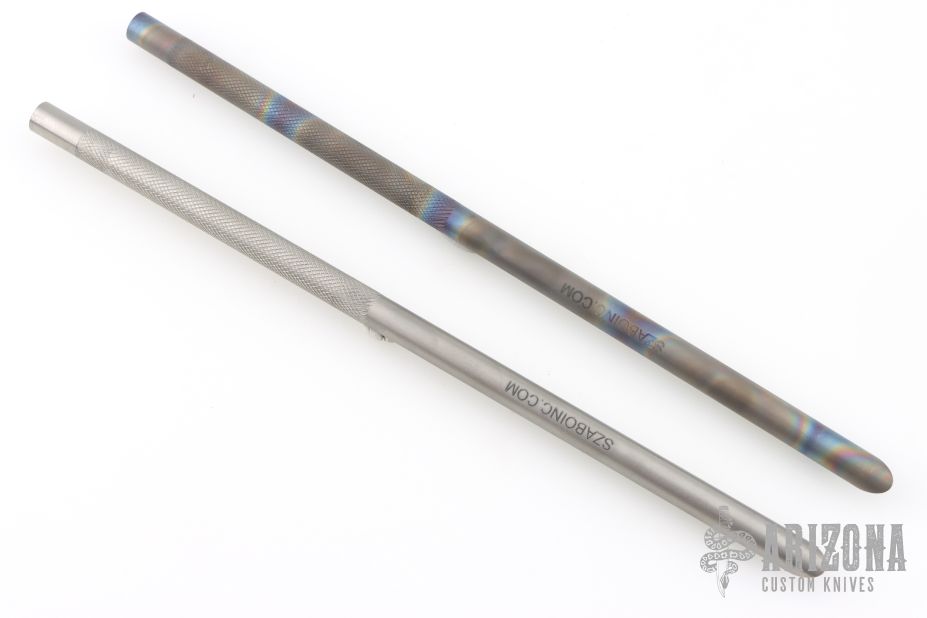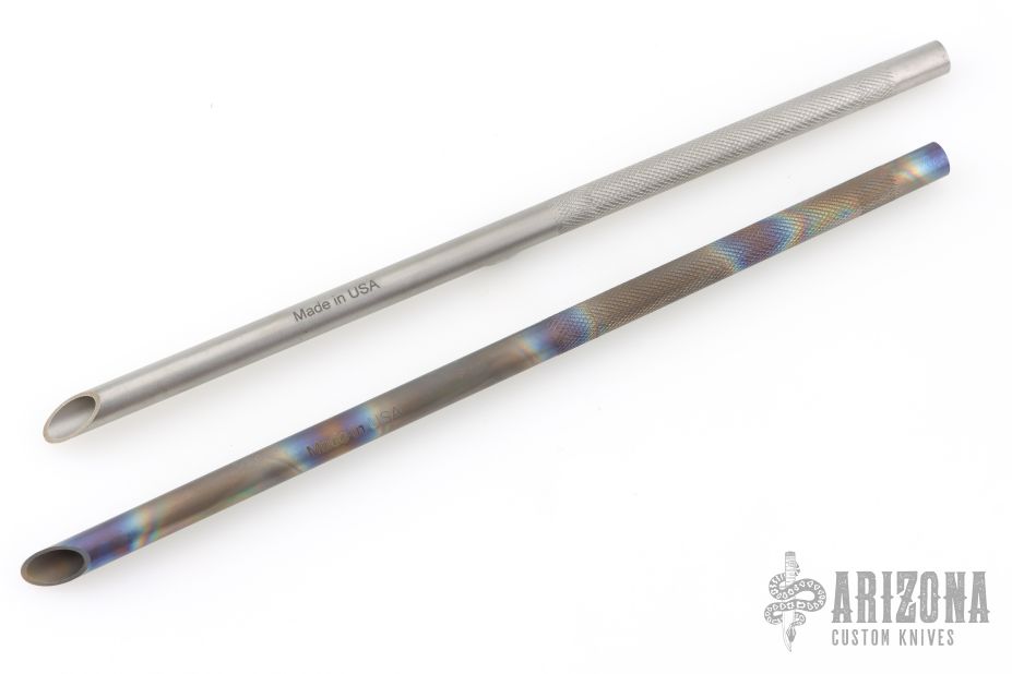 This Vampire Straw by Laci Szabo features a 10" integral construction hollow titanium rod, with knurled grip, .38" width, and sharp tip. One is anodized and one is bead blasted. New from maker.