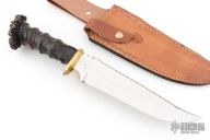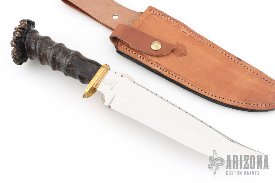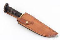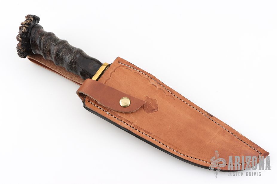 This knife by JA Lonewolf features a mirror polished blade with a false top edge and fileworked spine, .214" blade stock and 1.956" blade depth, hidden tang construction. The handle has a brass guard, impala horn grip with carved sea turtle on the butt. Excellent condition. Comes with a brown leather sheath.