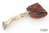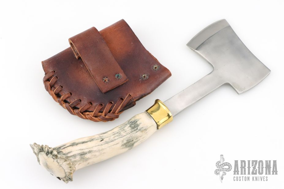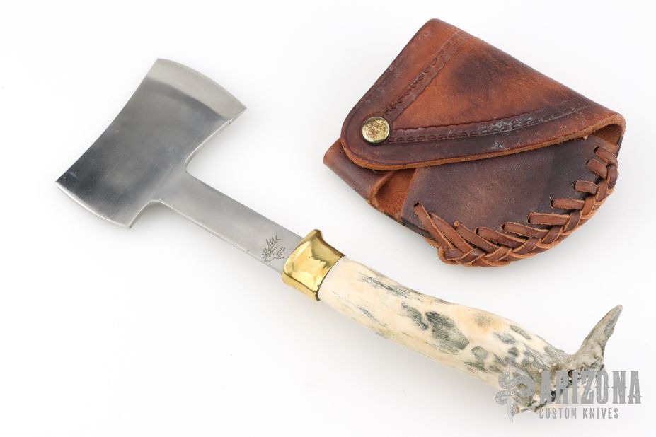 This belt axe by Jacobs' Custom features a satin finished blade with .177" blade stock and 4.125" from blade to pole, hidden tang construction. The handle has a brass guard and a crown stag grip. Comes with a hand tooled brown leather sheath. Has some light scratches and dings, otherwise good condition.
