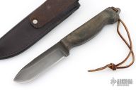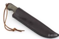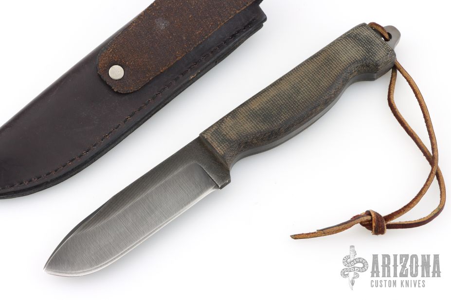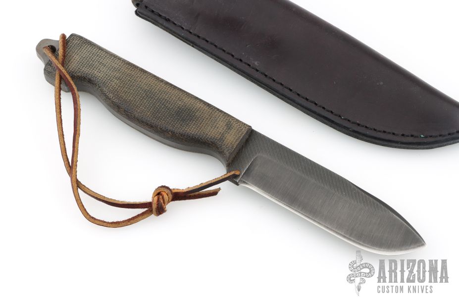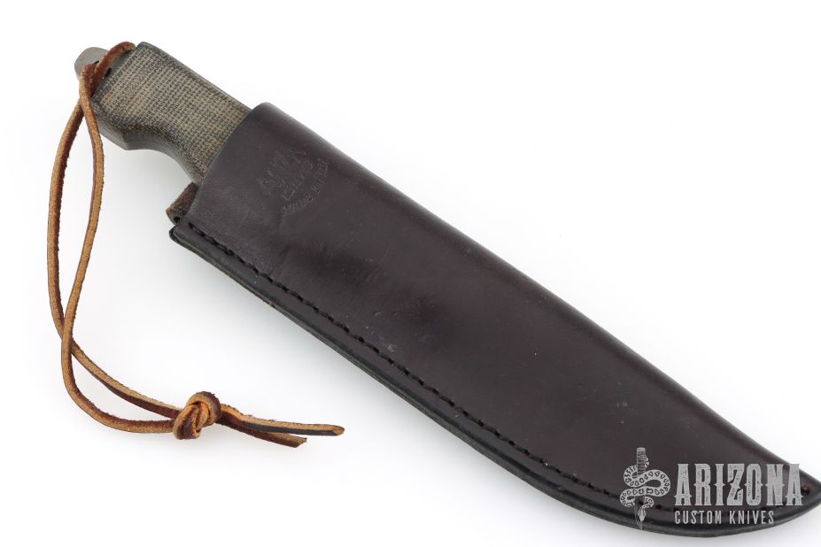 This file knife by Anza Knives features a blade made from a file, black canvas micarta scales, .191" blade thickness and 1.148" blade depth, full tang construction. Comes with a brown leather sheath. Dated '06. Excellent Condition.