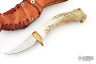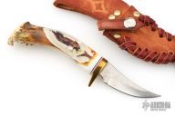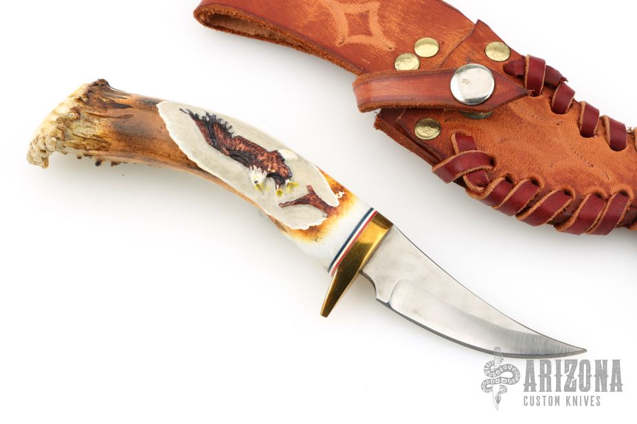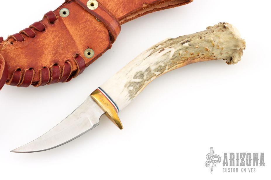This Skinner by Ken Richardson features an upswept blade with jeweled flats and satin grinds, .095" blade stock and .913" blade depth, hidden tang construction. The handle has a brass guard and crown stag grip, red/white/black spacers. Has a carved eagle on the handle. Comes with a brown leather sheath. Has a couple extremely light scratches, otherwise excellent condition.