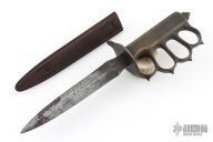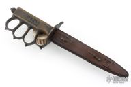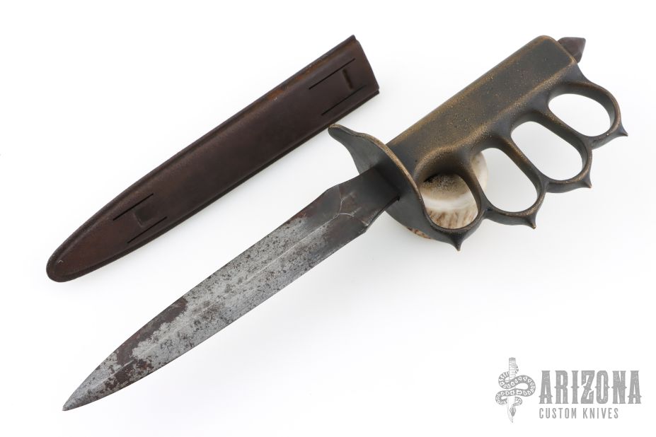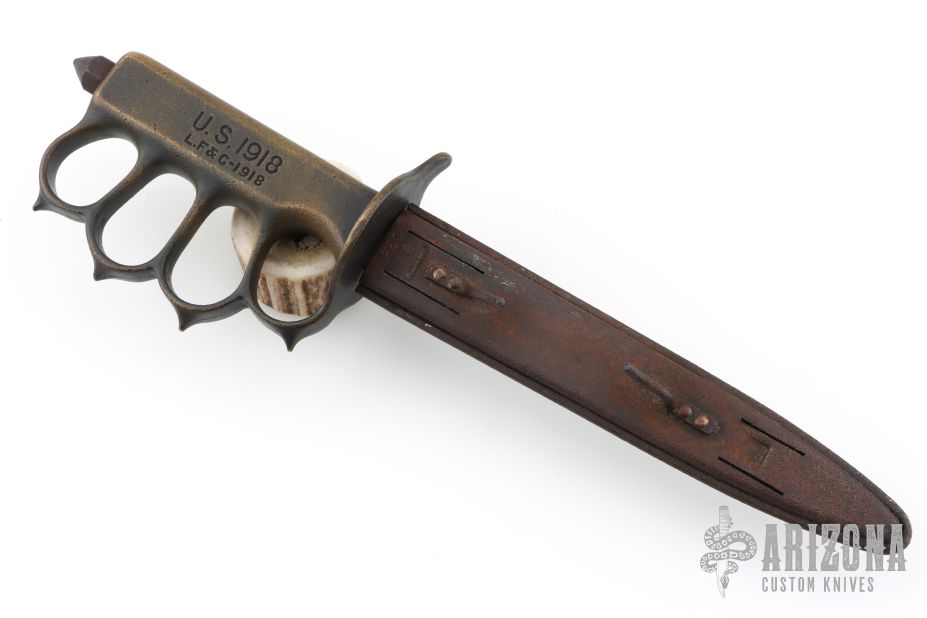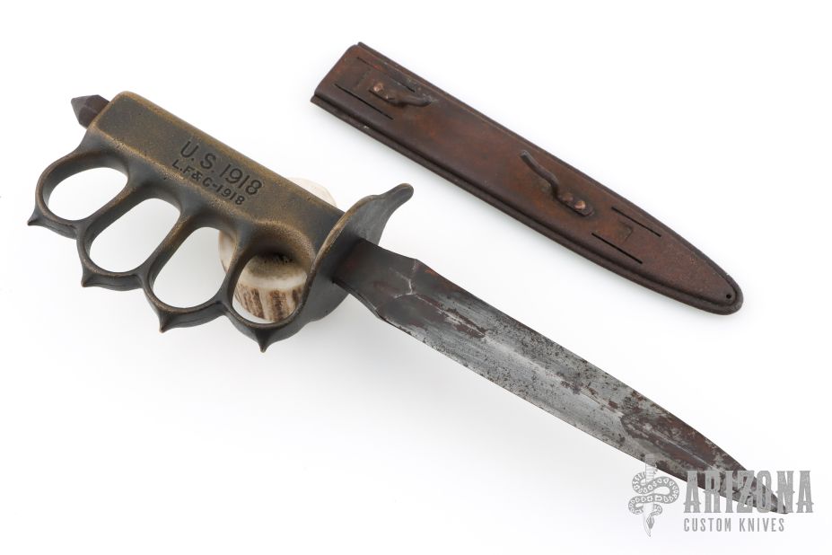 Extremely hard to find. This is a WWI trench knife made by L.F & C. Cast Bronze handle with U.S. 1918 stamped. Blade in excellent shape for its age. Comes with a metal scabbard with tabs intact. Has some scuffs, scratches, and patina/light oxidation. Excellent condition for its age, and great overall condition otherwise.