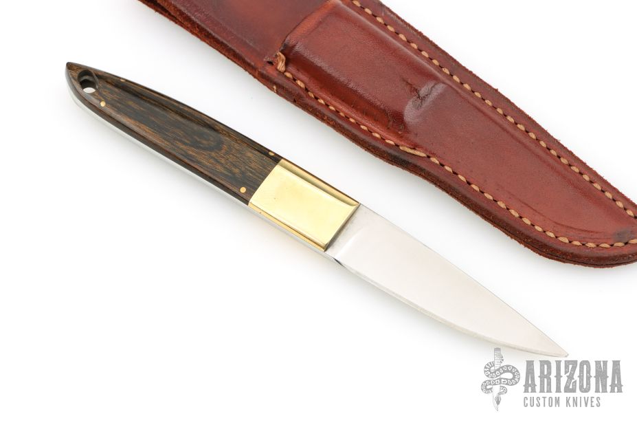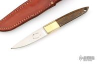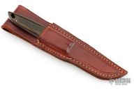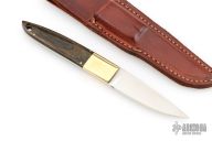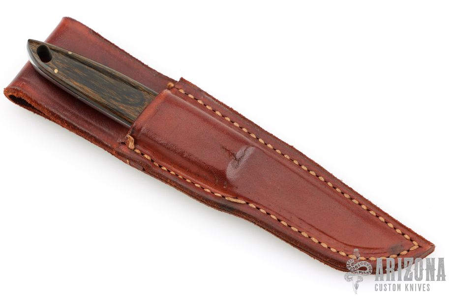 This knife by Ed Lary features a satin finished blade, .130" blade stock and .732" blade depth, full tang construction. The handle has brass bolsters and dymondwood scales with brass pins and lanyard hole. Comes with brown leather sheath. Has a blunted tip, otherwise excellent condition.