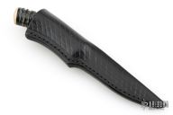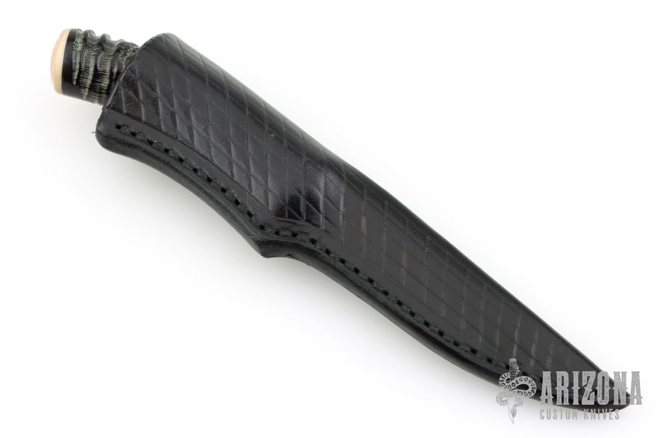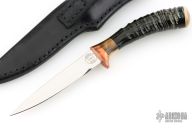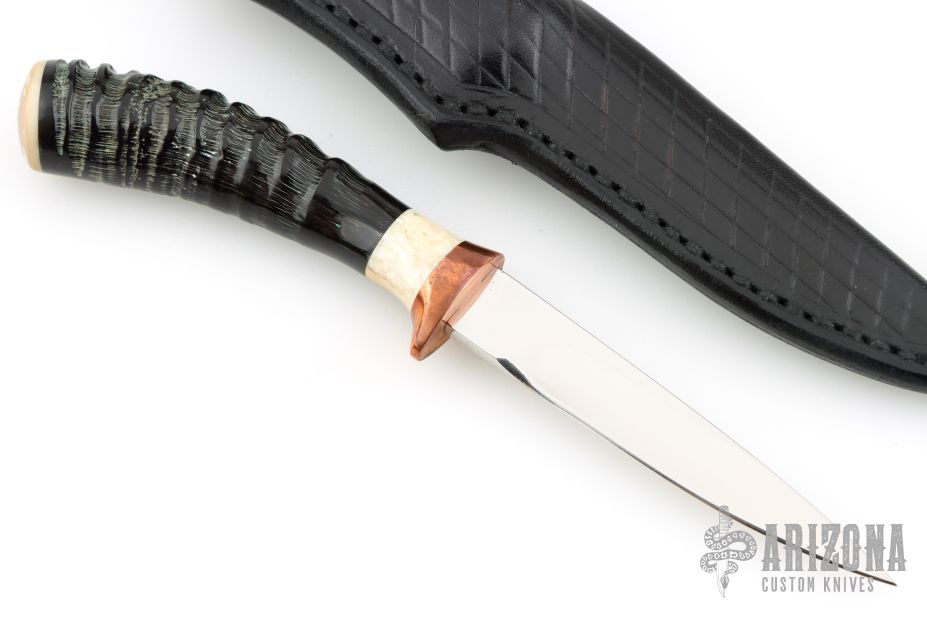 This knife by Stan McKiernan features a mirror finished blade with .162" blade stock and .568" blade depth, hidden tang construction. The handle has a copper guard, impala horn grip a walrus ivory spacer and butt. Comes with a black leather sheath. Excellent condition.
