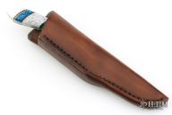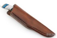 This Hunter by Kelgin Knives features a satin finished blade with .123" blade stock and .740" blade depth, full tang construction. The handle has brass bolsters, multi-piece scales. Comes with a brown leather sheath. Excellent condition.