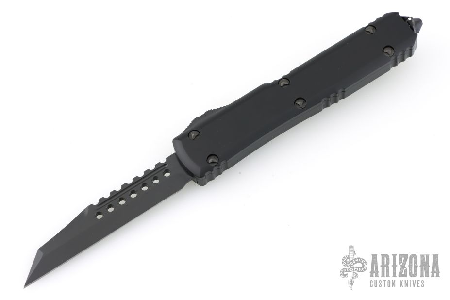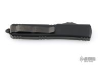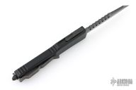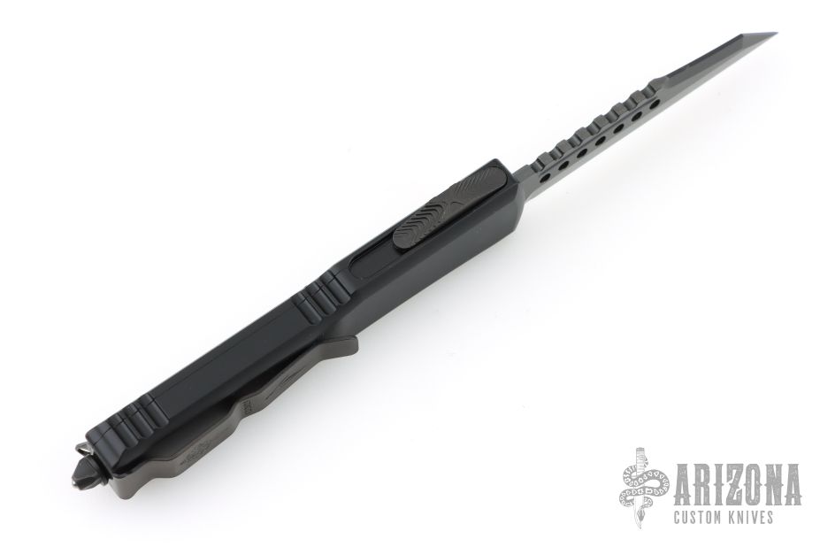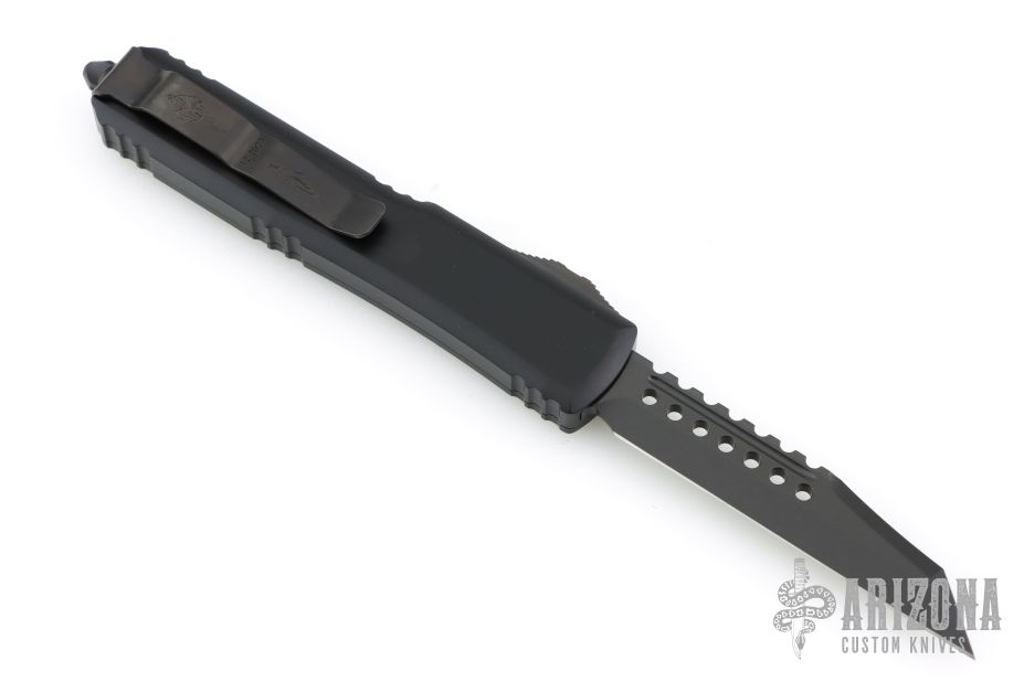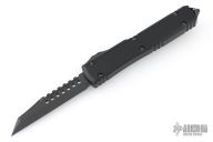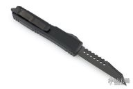This Ultratech Warhound by Microtech Knives features a black stonewash DLC blade with notched thumbrest and fullers, false top edge. The handle has a black aluminum frame with tip down black stainless steel clip, black DLC hardware, black titanium thumbslide. Comes with original box and papers. Dated 12/2023. Excellent condition.