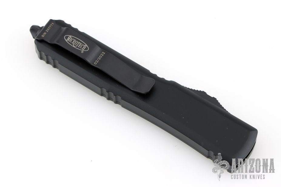 This Ultratech OTF automatic by Microtech features a T/E black blade. Black aluminum frame with a tip down stainless steel clip. Dated 02/2022 and S/N 237771. Comes with original box and papers. Has a couple light scuffs, excellent condition.