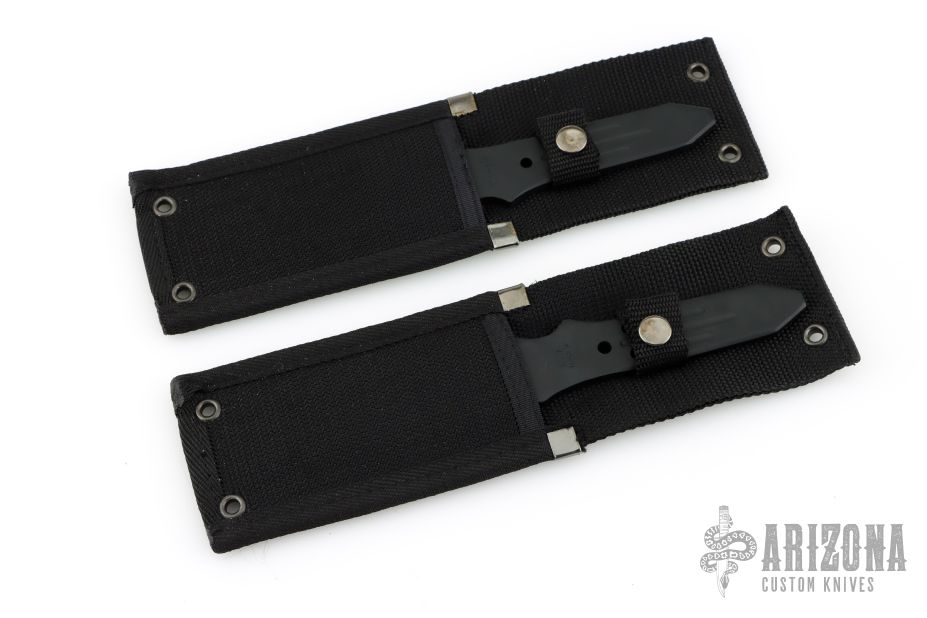 These RG57 Throwing Knives by Rigid Knives features a black blade with false top edge, .205" blade stock and 1.610" blade depth, full tang construction. Comes with original boxes and black nylon sheath. They have some light scuffs, otherwise excellent condition.