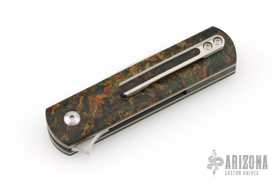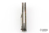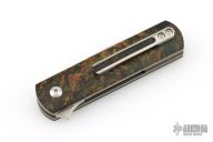 This Linerlock One Off by Ray Laconico features a hand rub satin finished blade with flipper. The handle has vintage bowling ball rag micarta scales and backspacer, titanium liners and tip up clip with rag micarta inlay. Nice detent, lockup and blade seating. Comes with a zippered case. Excellent condition.