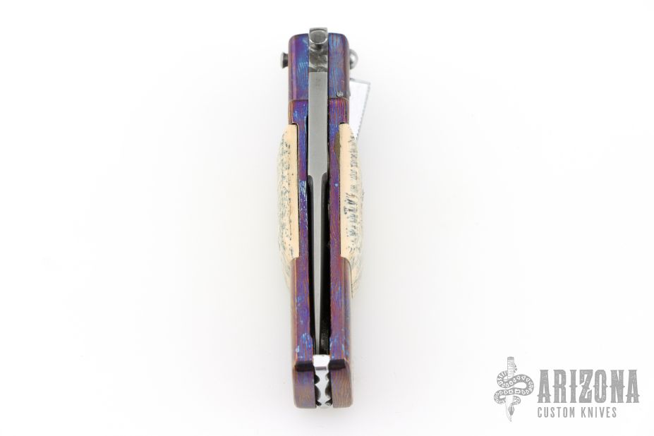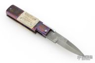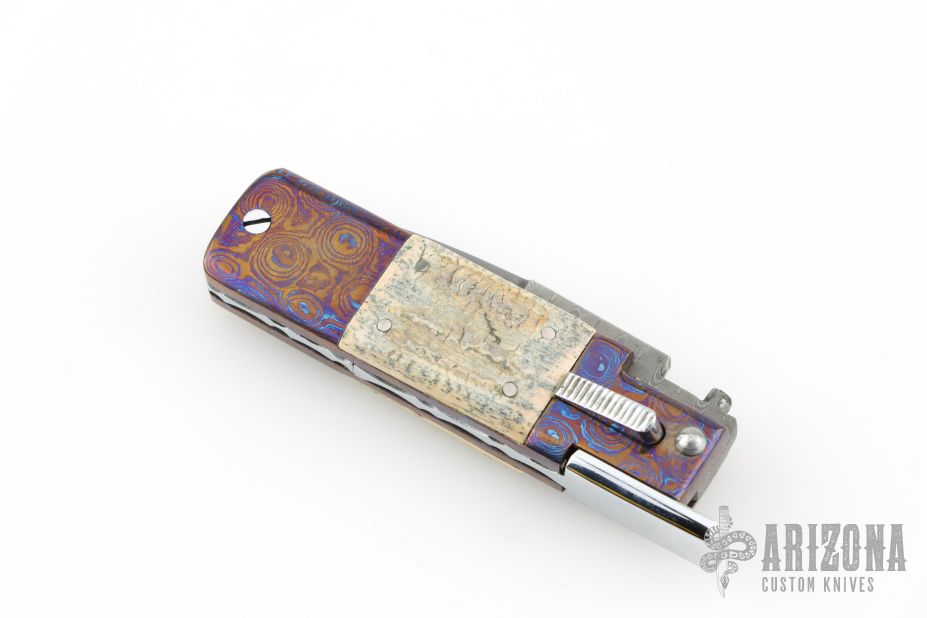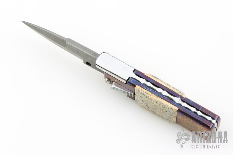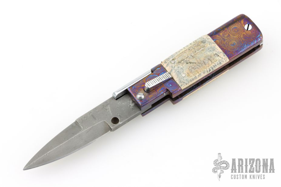 This Picklock Auto by Agasi Hambartsumian of Armenian Doctor Knives features a Damascus bayonet ground blade with a false top edge. The handle has a Titanium Damascus frame with fileworked stainless steel backspacer, mammoth ivory scales with nickel silver pins. New from maker.