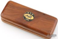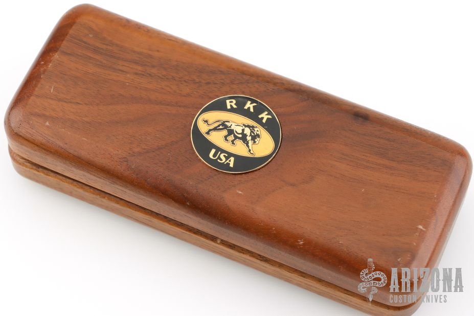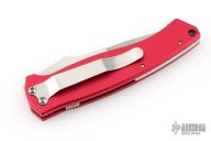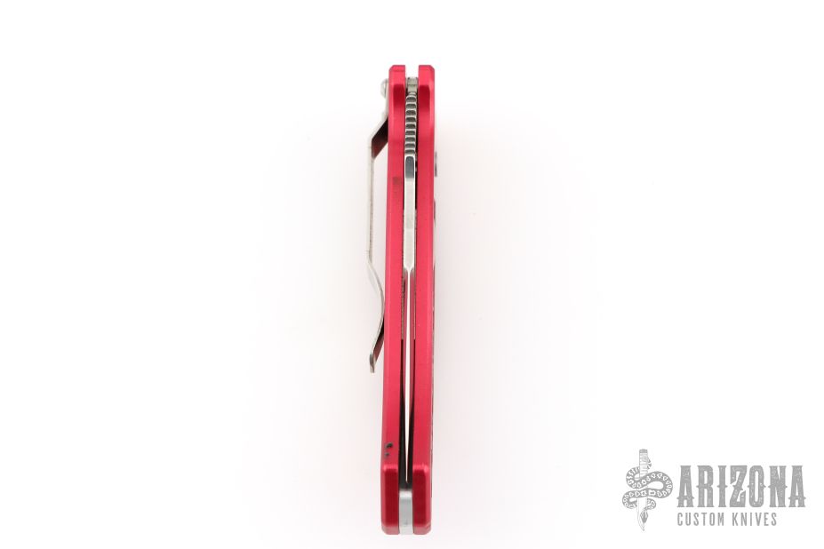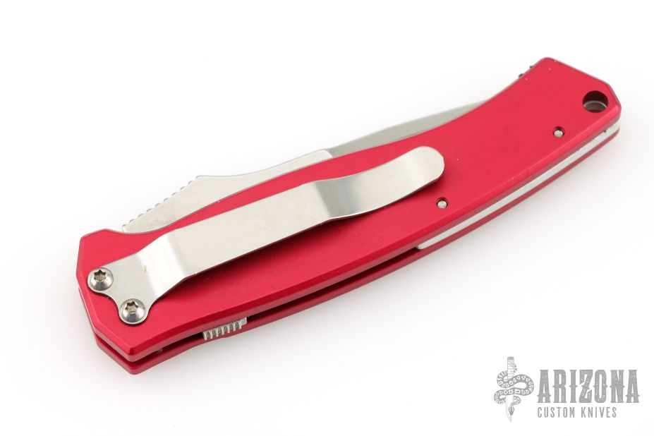 This is a Swift Striker II automatic by Randall King Knives features a mirror polished blade, notched thumbrest and false top edge. The handle has a red aluminum frame with a safety on the spine, and a tip down stainless steel clip. Comes with original box. Has some light scuffs, otherwise excellent condition.