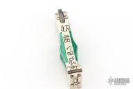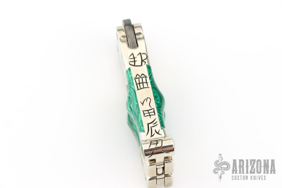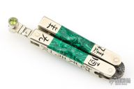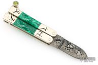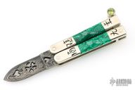 This balisong by Paul Jarvis features a pieced Damascus blade with hearts and a flower, edges are not sharp. Has engraved nickel silver channel construction handles with dovetailed malachite scales, nickel silver T-Latch with yellow/green stone inlays. The handles are engraved with symbols. Excellent condition. Comes with a zippered case.