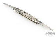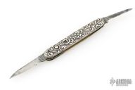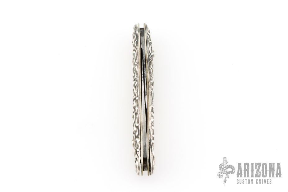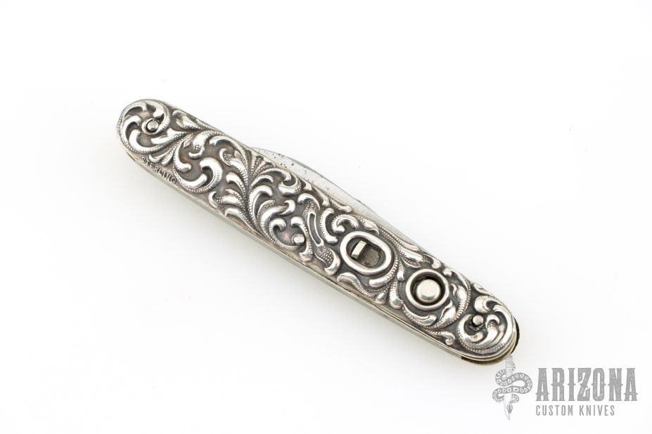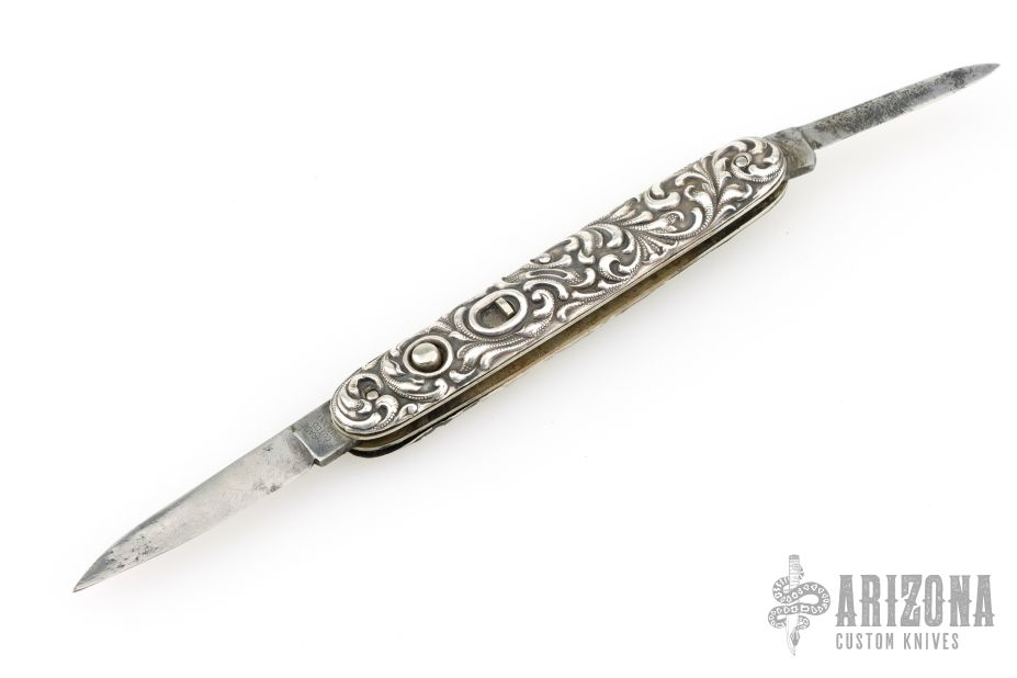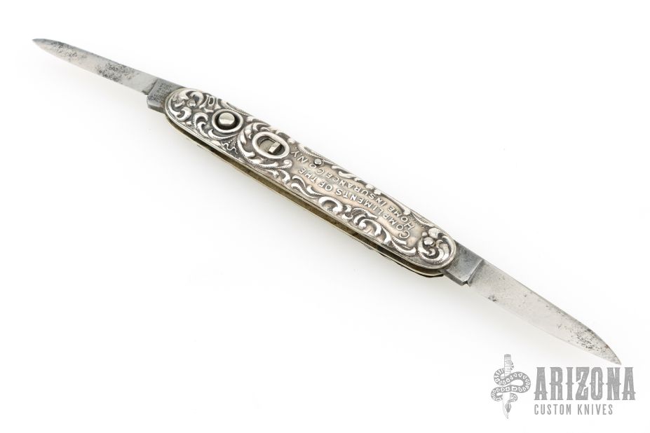 This double auto by Schrade Cutco is about or approaching 100 years old, it features two blades both with their own push button and safety. The handle has engraved Sterling silver scales with "Compliments of the Home Insurance Co NY", nickel silver liners and steel backspacer. Has some pitting on the blades, otherwise good condition for its age!