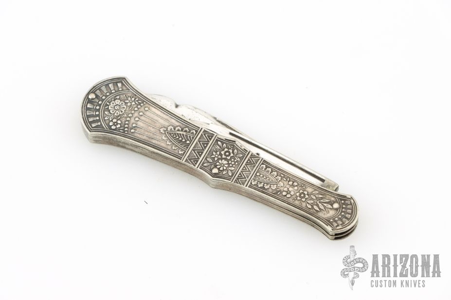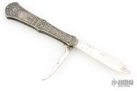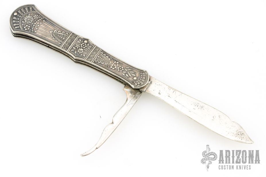 This Antique Fruit Knife has a silver blade with nail nick, has engraving, the other blade is a small silver pick for picking out seeds. The handle has stamped silver scales with silver springs and liner. Has half stops. Has some scratches and dings, its old..., otherwise good condition for its age.