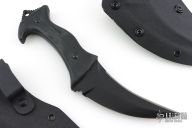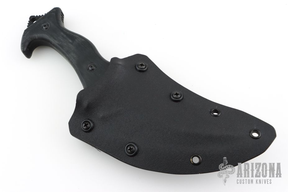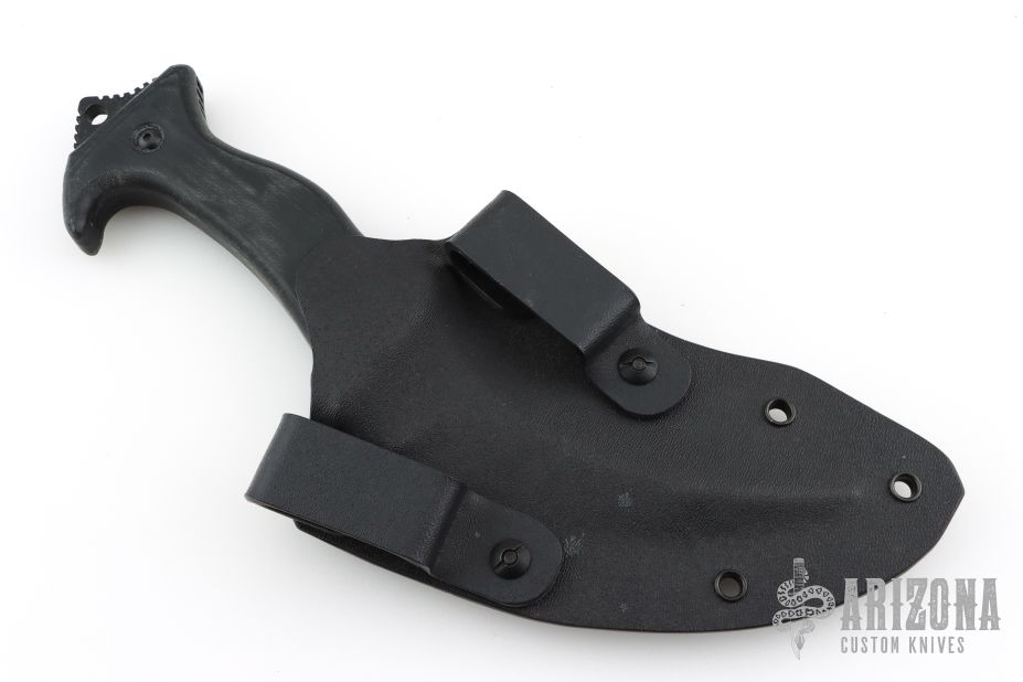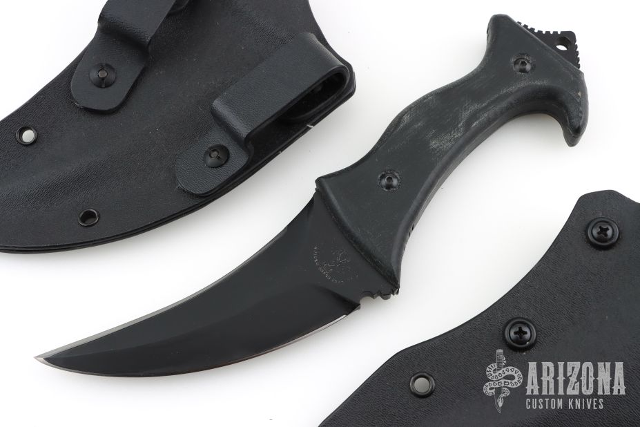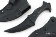 This Omani is a Laci Szabo design executed by Robert Newton, it features a double edged blade, .271" blade stock and 1.780" blade depth, full tang construction with black canvas micarta scales and extended tang with lanyard hole. Comes with two kydex sheaths with belt loops. New from maker!