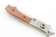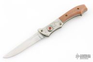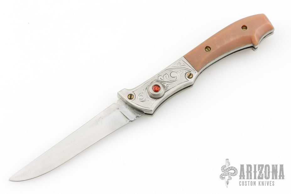 This Vintage Switchblade by R.P.K. features a satin polished blade. The handle has engraved aluminum overlaid bolsters over an integral steel frame, brown composite scales. Coil spring, knurled button with red stone inlay. Has some pitting on the blade and scratches throughout, otherwise good condition.