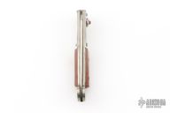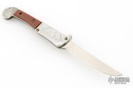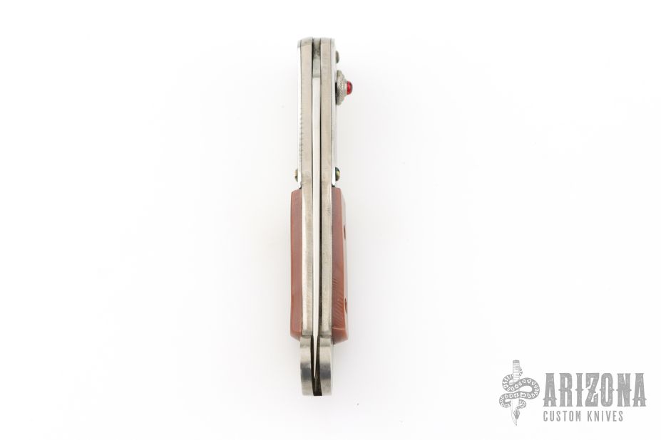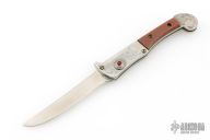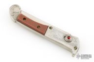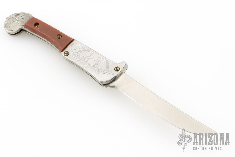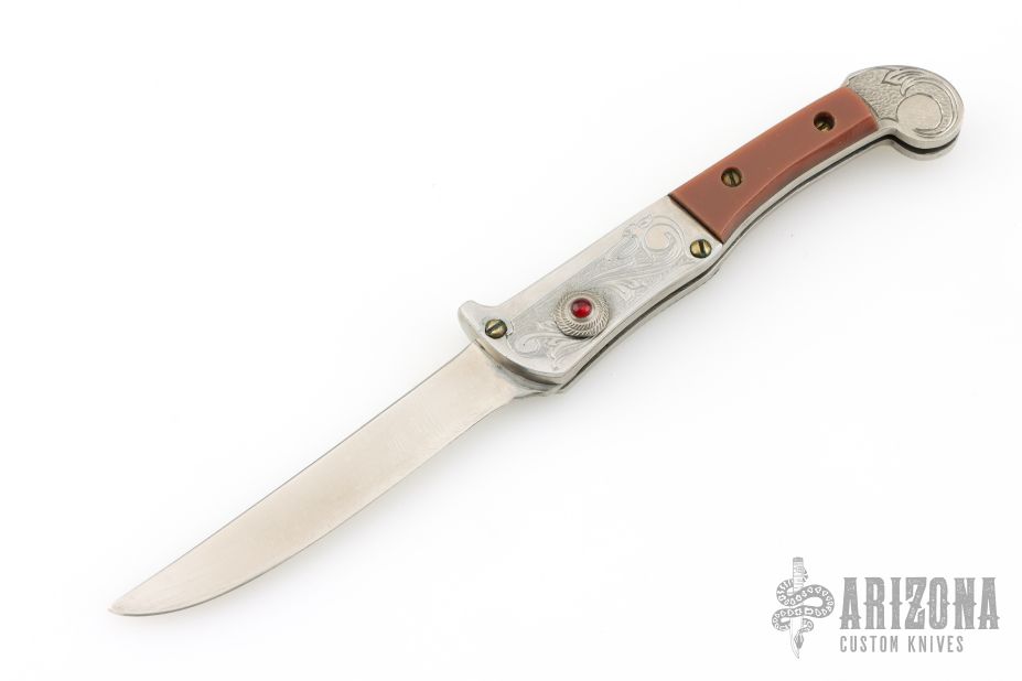 This Vintage Switchblade by R.P.K. features a satin polished blade. The handle has engraved steel overlaid bolsters over an engraved integral steel frame, brown composite scales. Coil spring, knurled button with red stone inlay. Has scratches throughout, otherwise good condition.